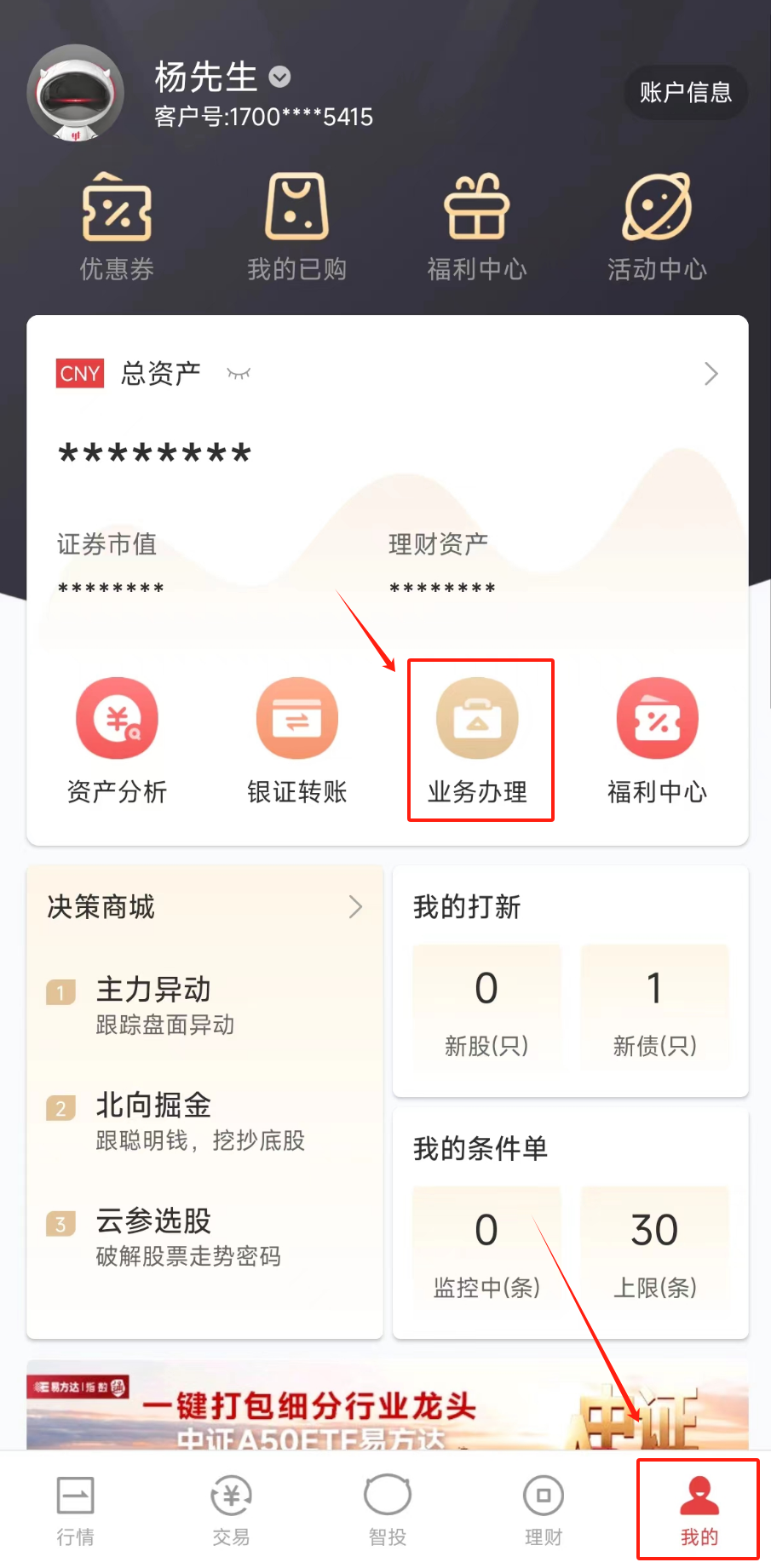 第1步:打开华宝智投APP,点击「我的」-「业务办理」