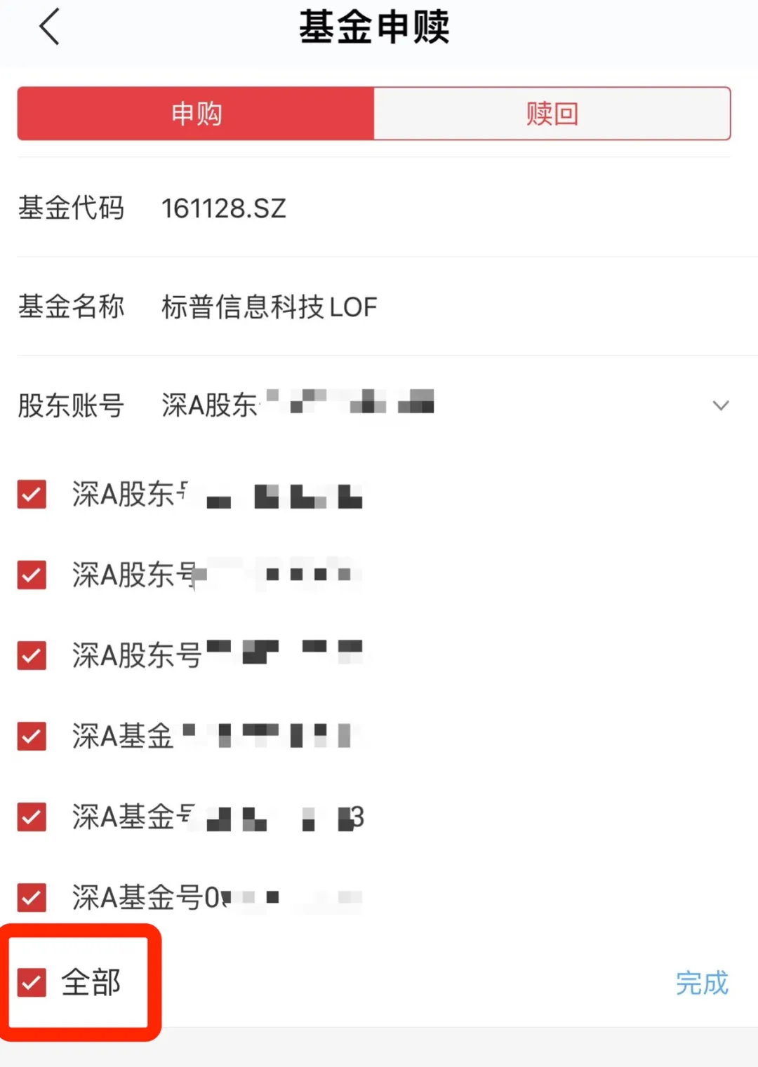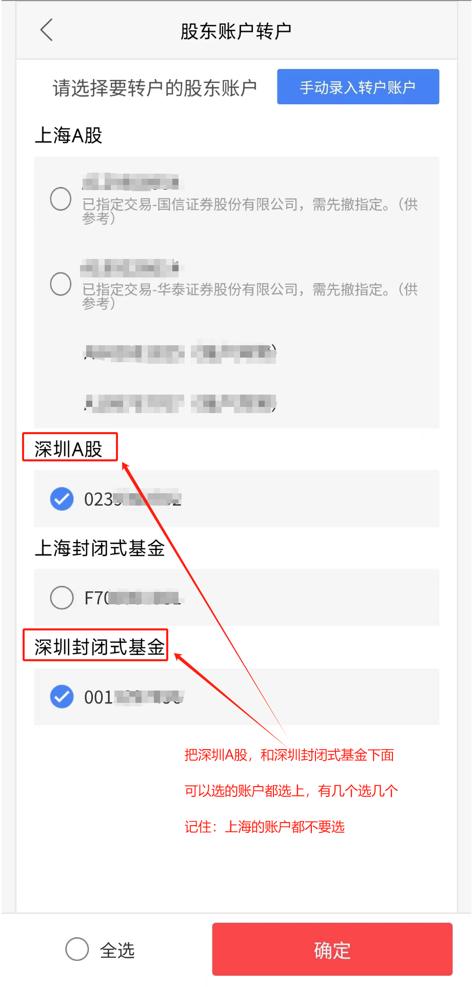 然后勾选所有的深圳A股、深圳封闭式基金账户。