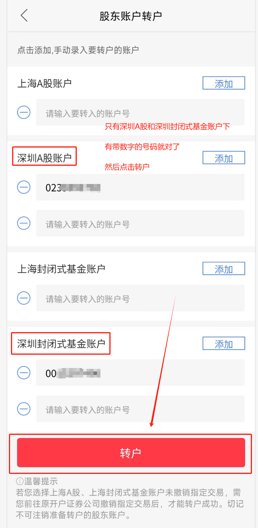 第4步:进入股东账户转户页面后,选择「深圳A股」和「深圳封闭基金」,确认转户