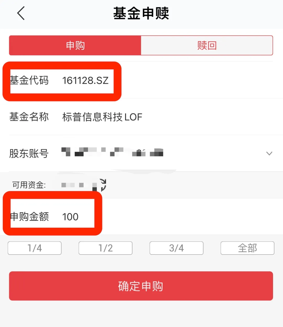以161128 标普信息科技LOF为例,限购100元,那就输入100元就行了。