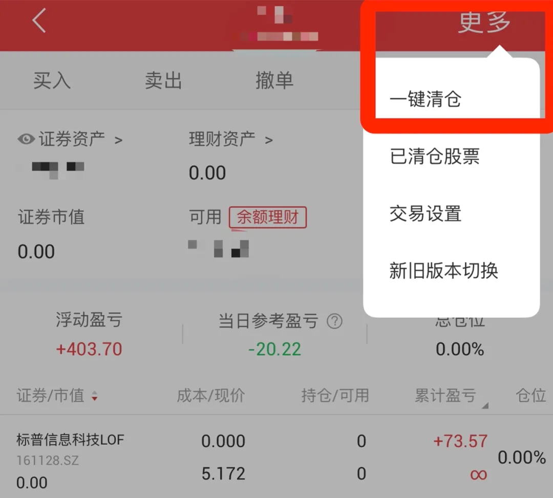 想快速卖出,还可以点击右上角「更多-一键清仓」,直接把6个账户全部卖出: