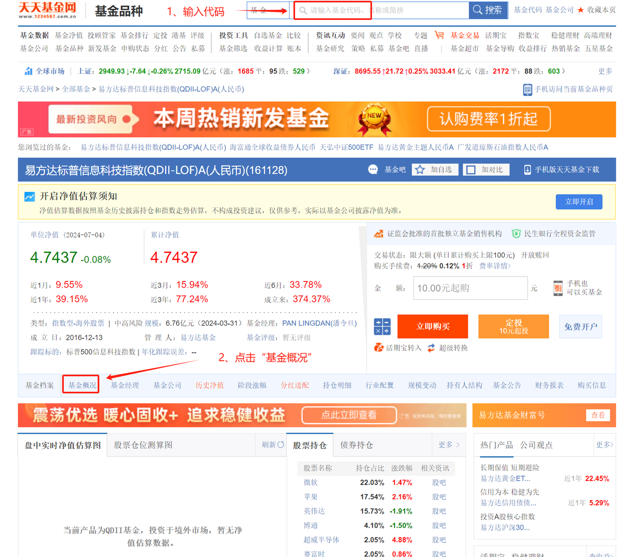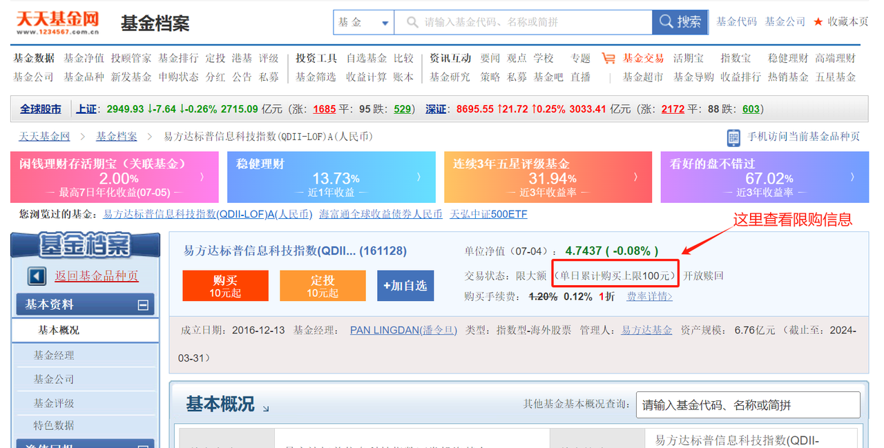 比如当前限购的标普信息科技LOF(161128),在天天基金网上,输入代码。