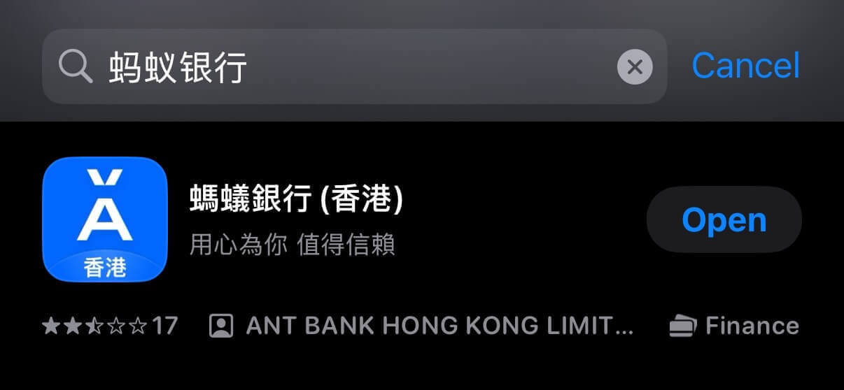 苹果用户在AppStore搜索 "蚂蚁银行",找到 "螞蟻銀行(香港)" 这个App下载。