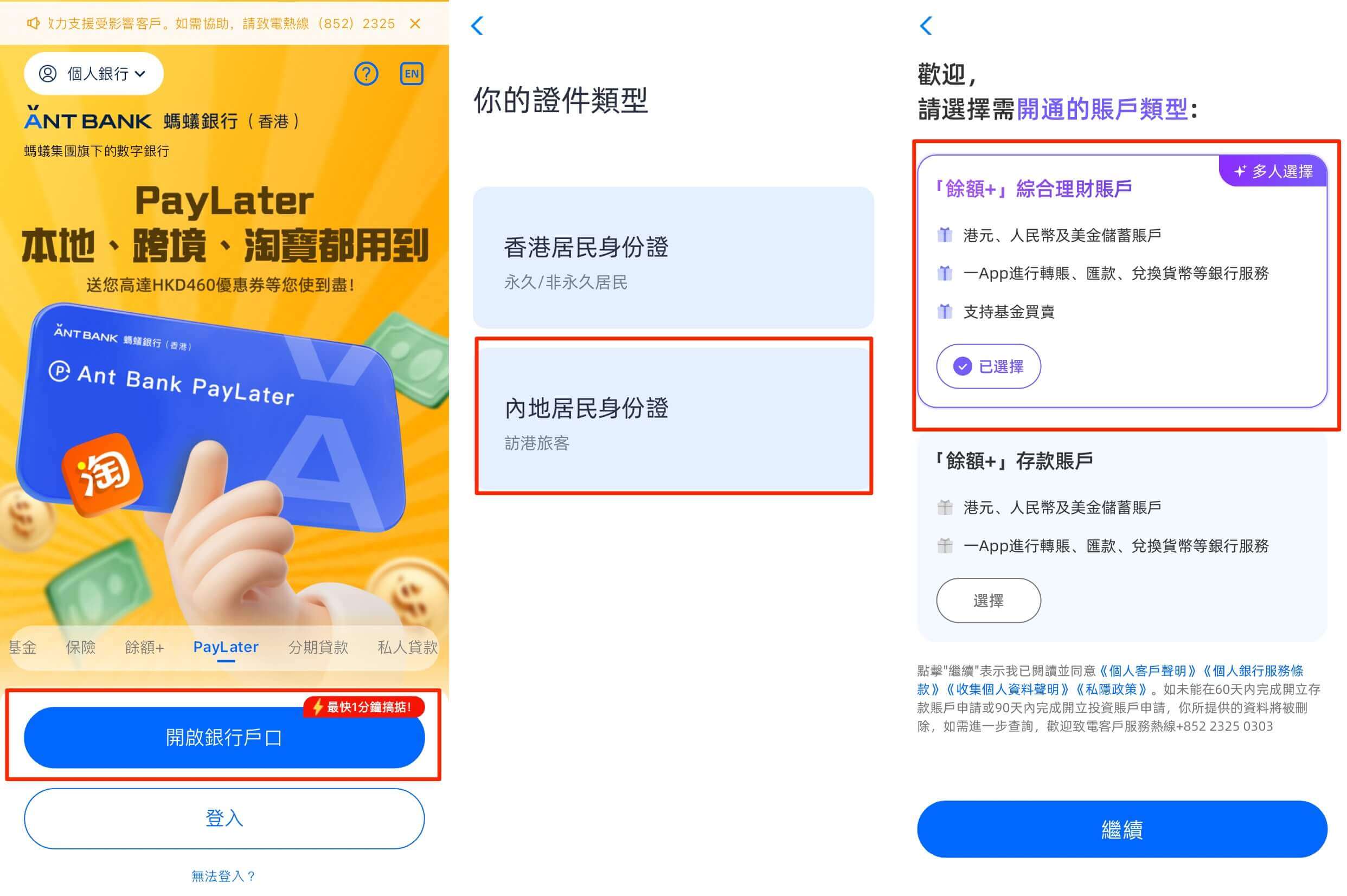 在App中选择 "開啟銀行戶口" > "內地居民身份證" > "「餘額+」綜合理財賬戶",按照App指引完成开户。
