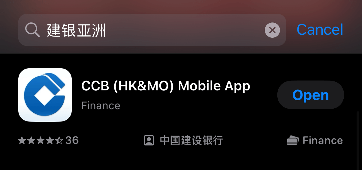 苹果用户在AppStore搜索 "建银亚洲",找到 "CCB (HK&MO) Mobile App)" 这个App下载。