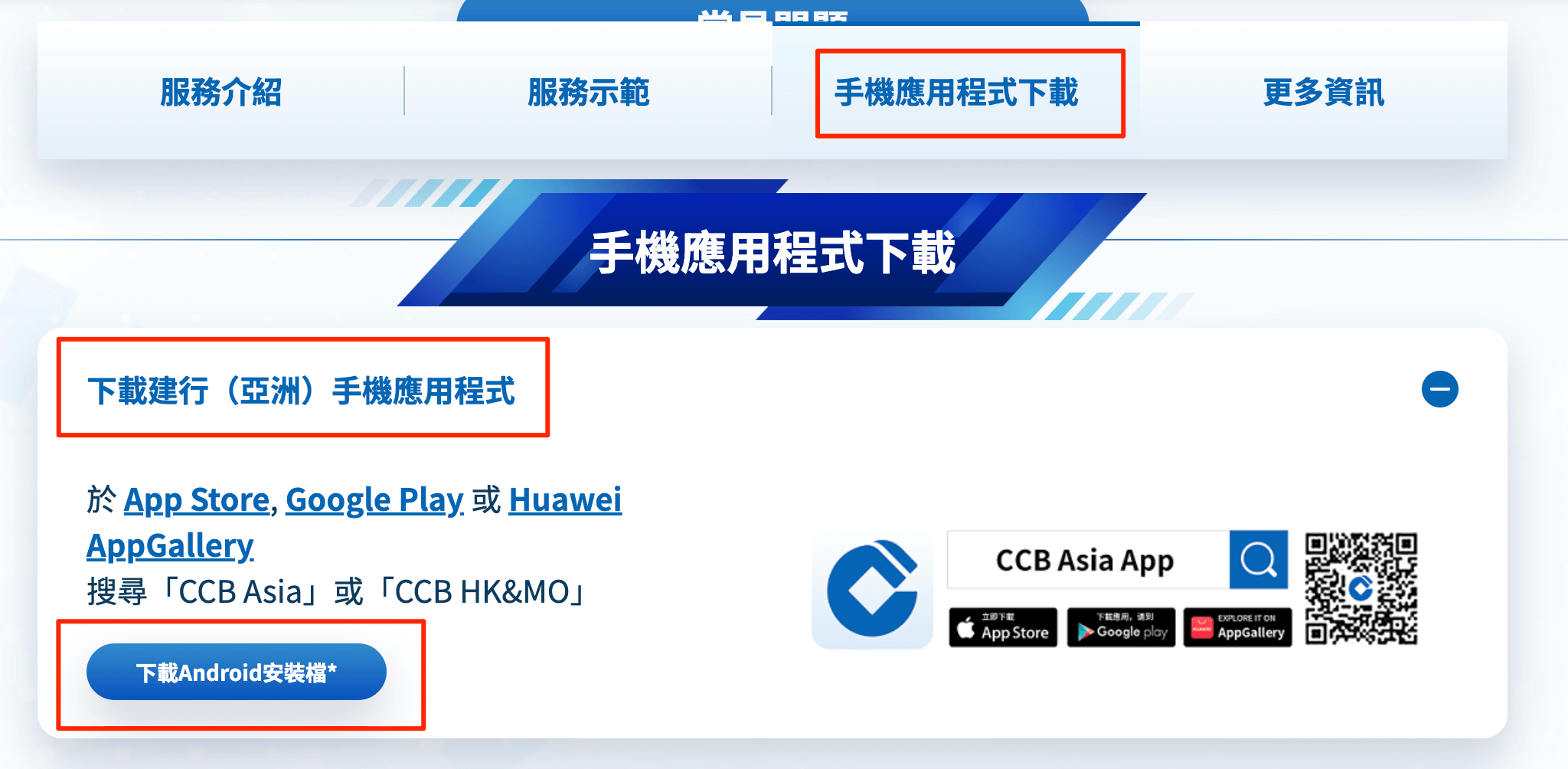 选择 "手機應用程式下載" > "下載建行(亞洲)手機應用程式" > "下載Android安裝檔"*