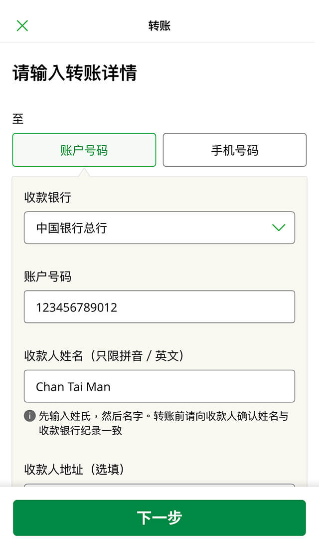 2、选择转账至内地账户号码或手机号码,然后根据指示输入收款人资料。