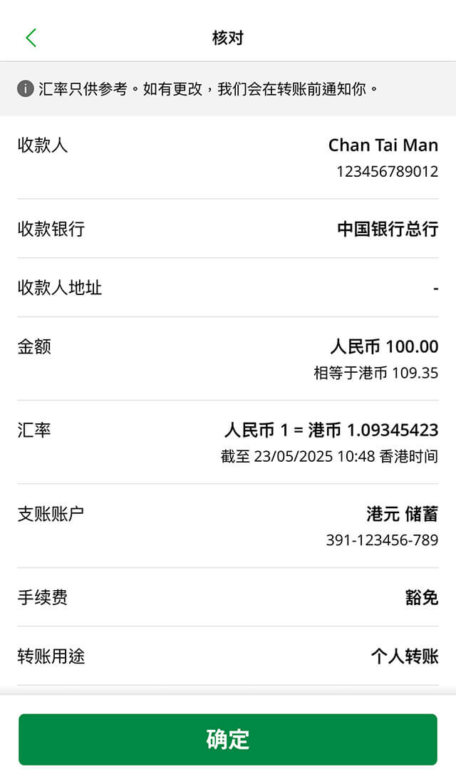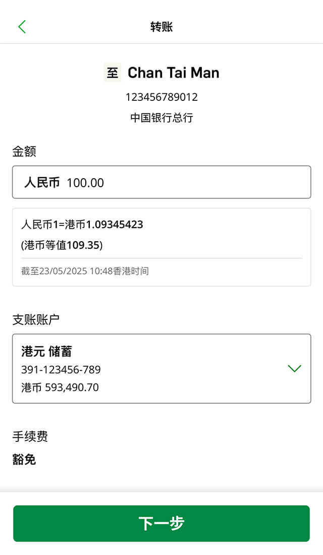 - 北向提供人民币或港币汇款(同时支援从人民币账户扣帐或港币账户即时兑换人民币汇款)、人民币收款的选项。