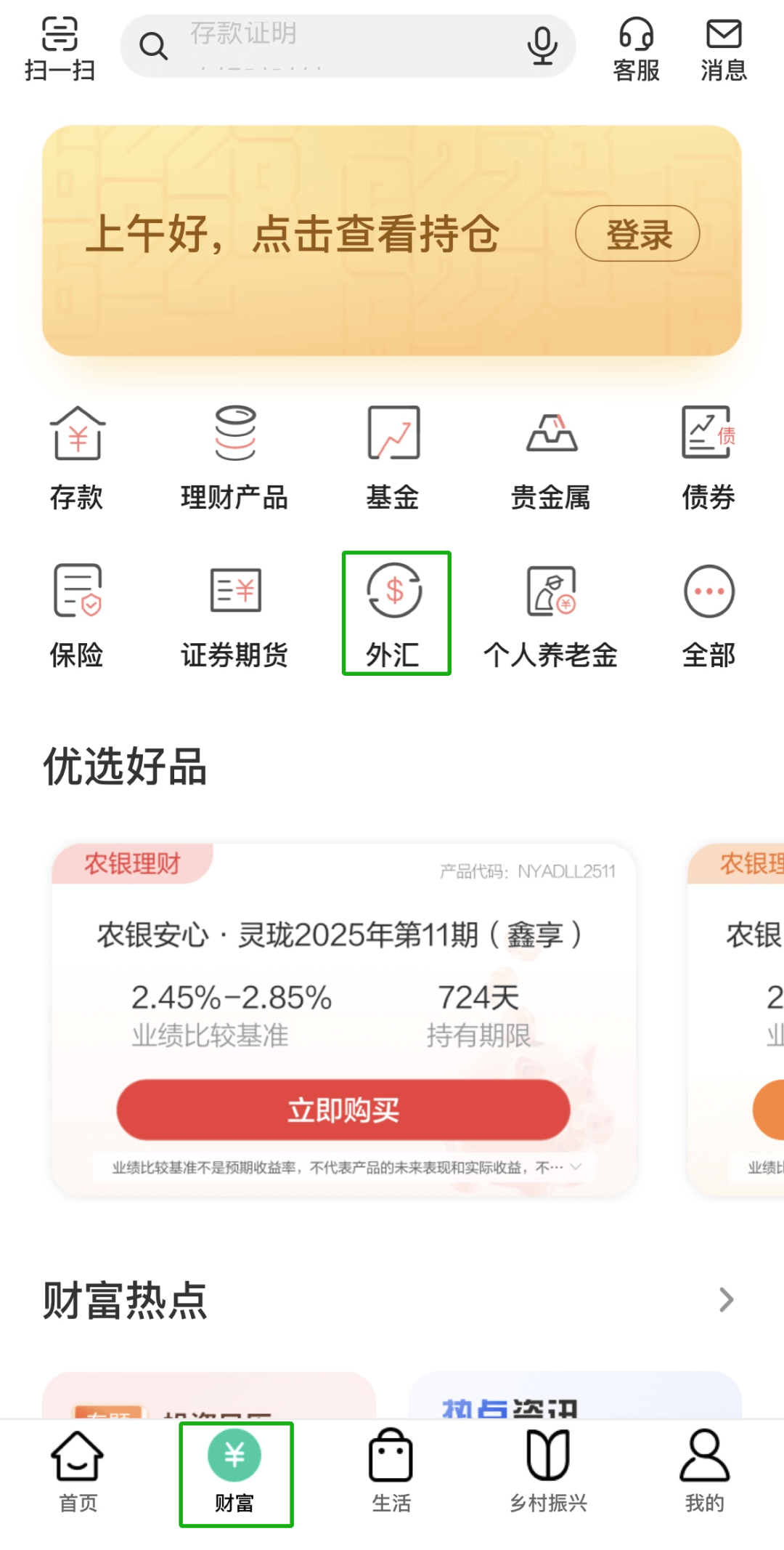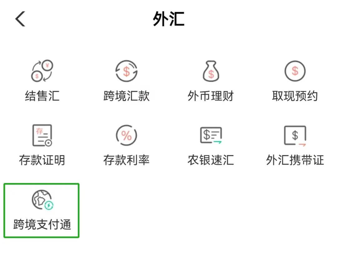 1、跨境支付通业务功能入口为“掌银首页-财富频道-外汇-跨境支付通”。