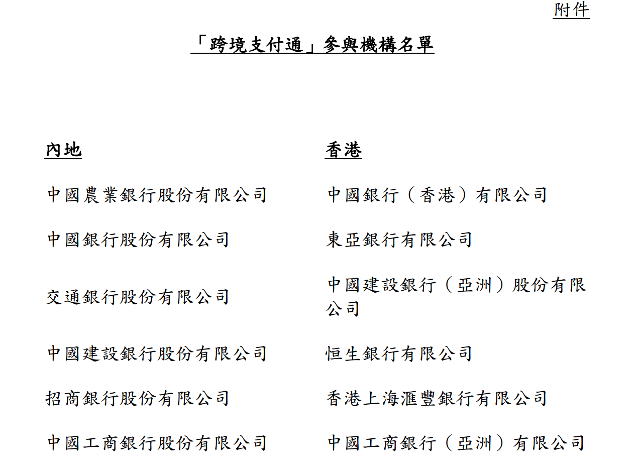 香港参与机构为:中银香港、东亚银行、建银亚洲、工银亚洲、恒生、汇丰。