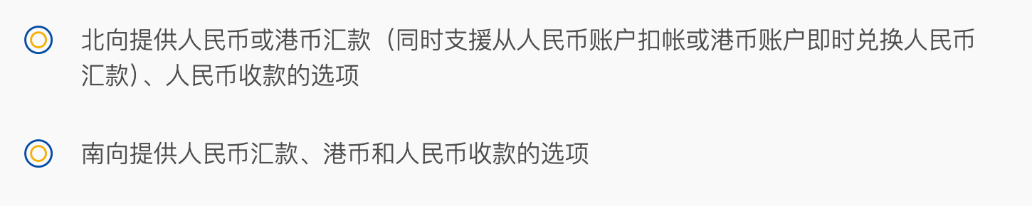 - 南向提供人民币汇款、港币和人民币收款的选项。