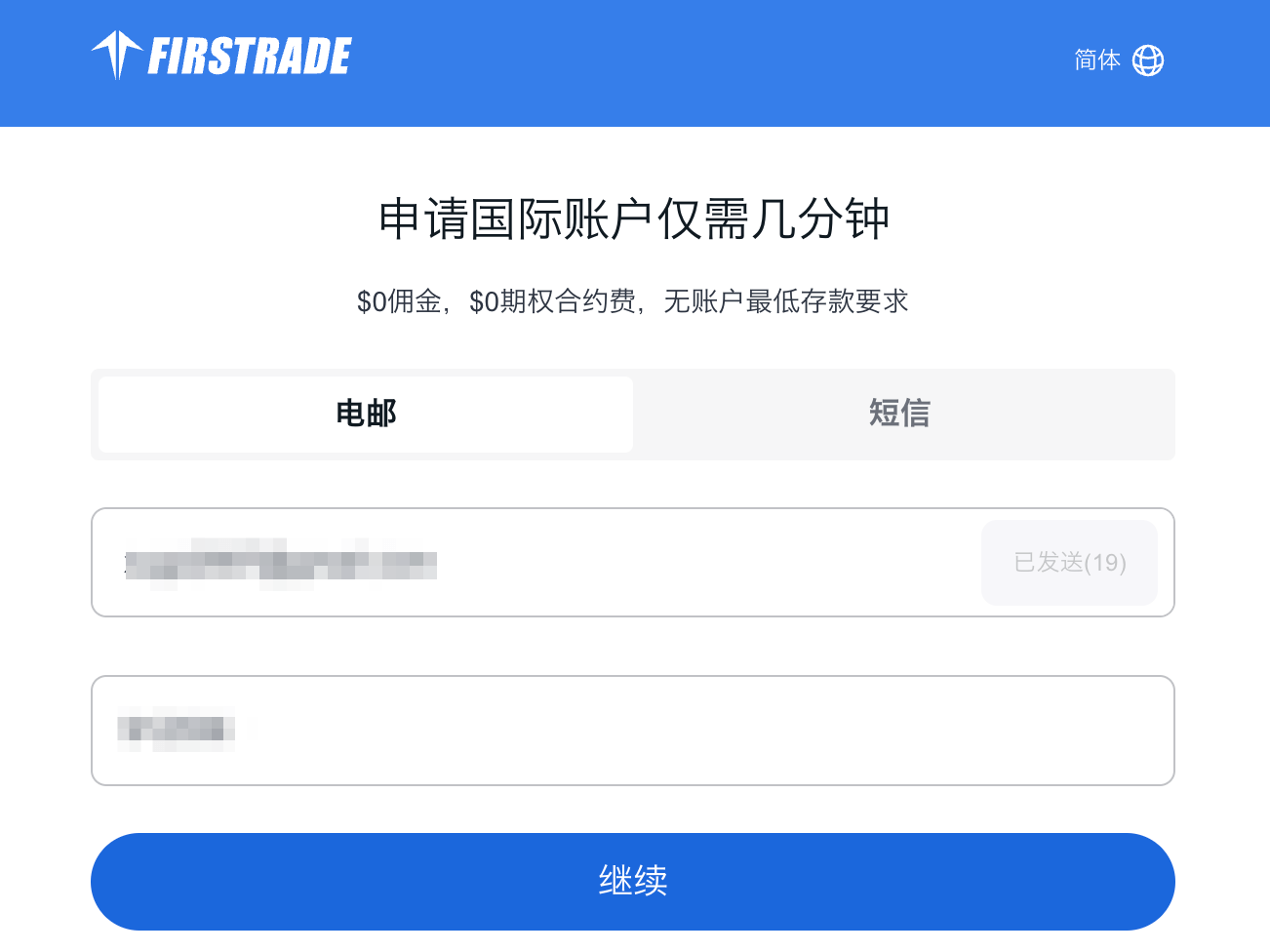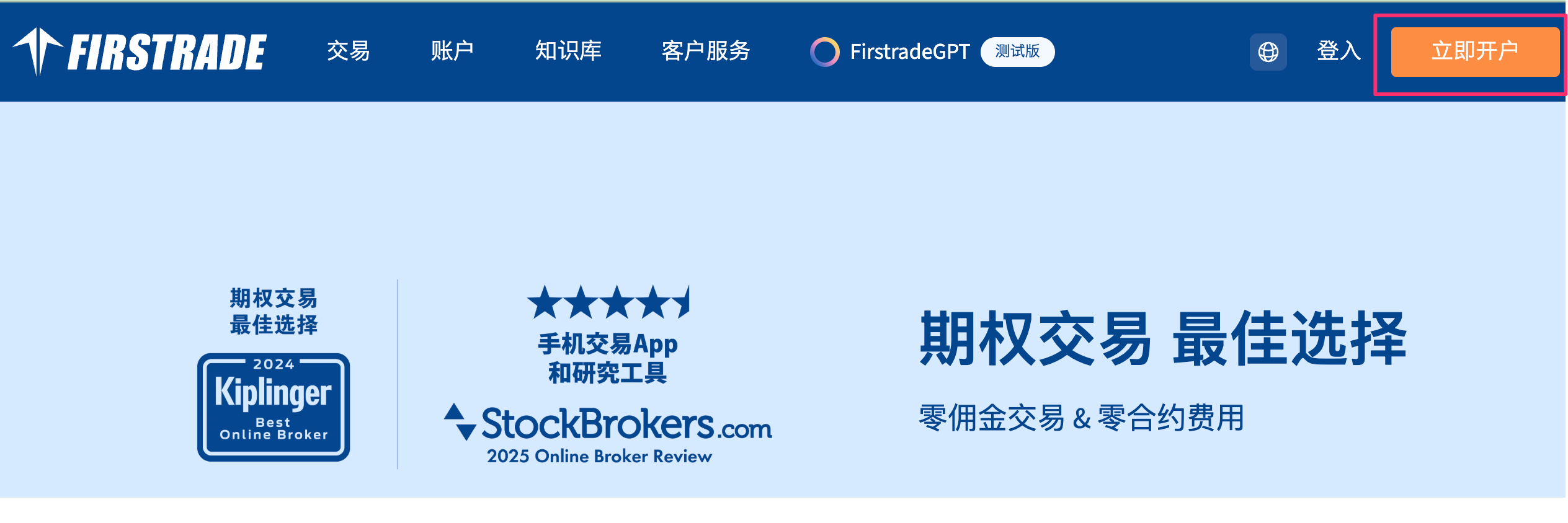 1、打开 https://www.firstrade.com/zh-CN,点击右上角"立即开户"。