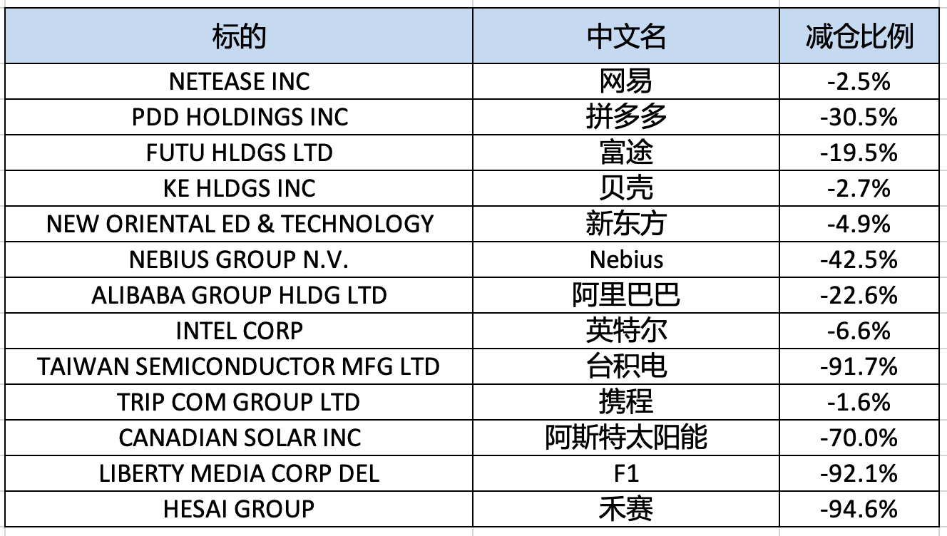 - 减仓标的为:网易,拼多多,富途,贝壳,新东方,Nebius,阿里巴巴,英特尔,台积电,携程,阿斯特太阳能,F1,禾赛;其中台积电减仓91.7%。