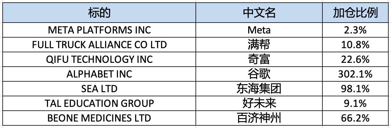 加仓标的为:Meta, 满帮, 奇富, 谷歌, 东海集团, 好未来, 百济神州; Google加仓比例最高,Sea次之。