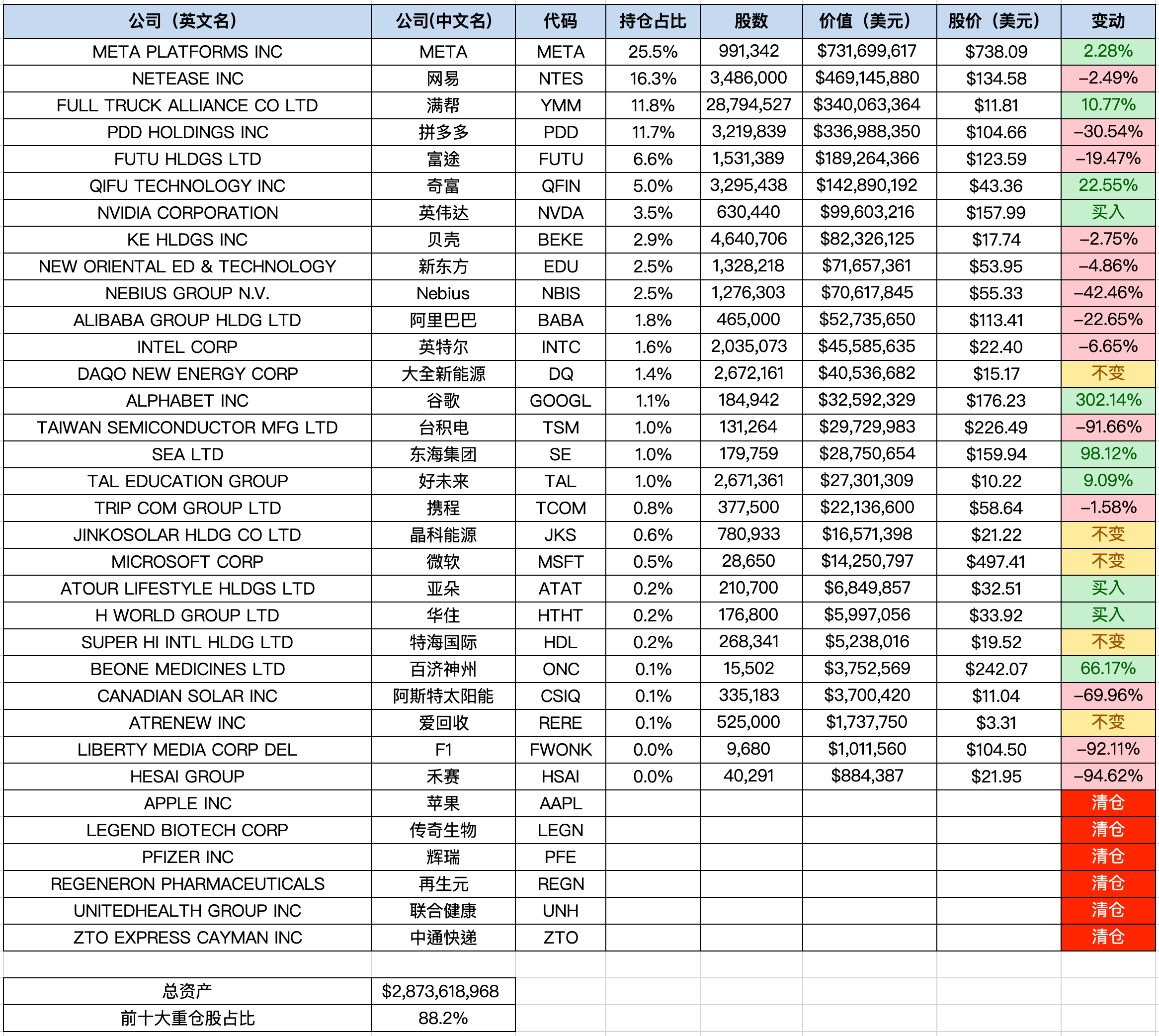 其中前十大重仓股分别是Meta,网易,满帮,拼多多,富途,奇富,英伟达,贝壳,新东方,Nebius, 前十大重仓股占比88.2%。