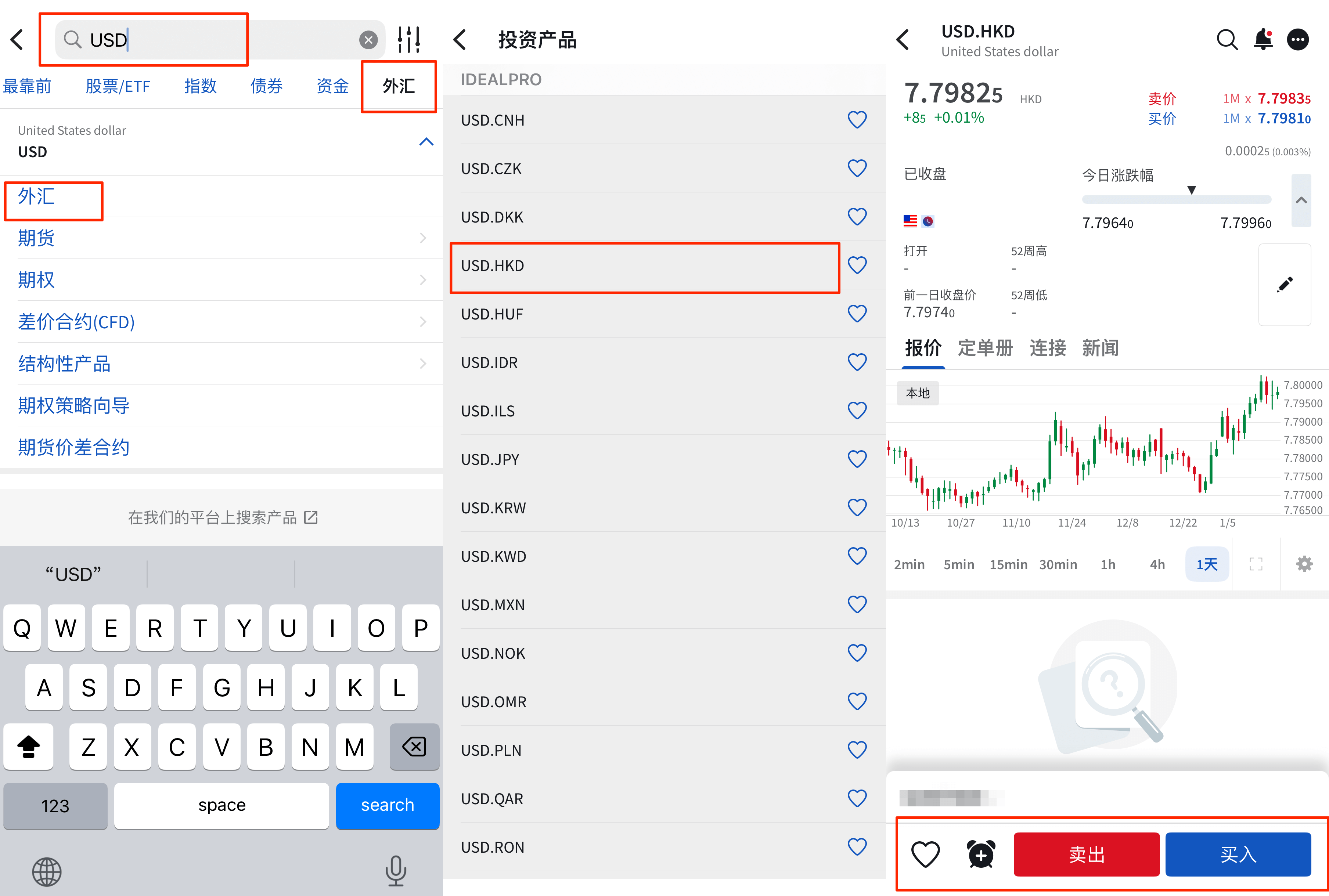 比如像上面的步骤,找到「USD.HKD」货币对页面,下面有「买入」、「卖出」两个按钮。