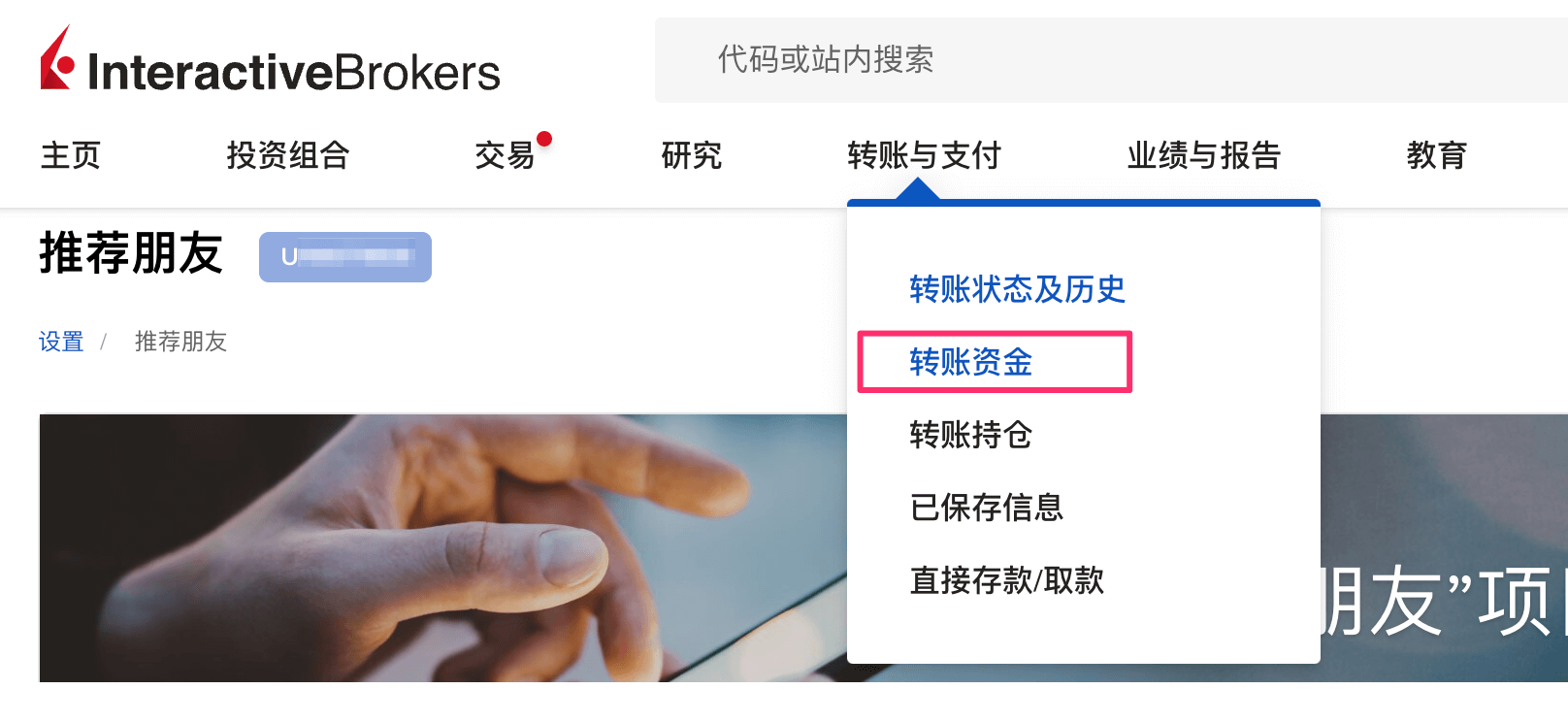 1、登录盈透证券后台 https://www.ibkr.com.cn/sso/Login, 选择"转账支付" > "转账资金"。
