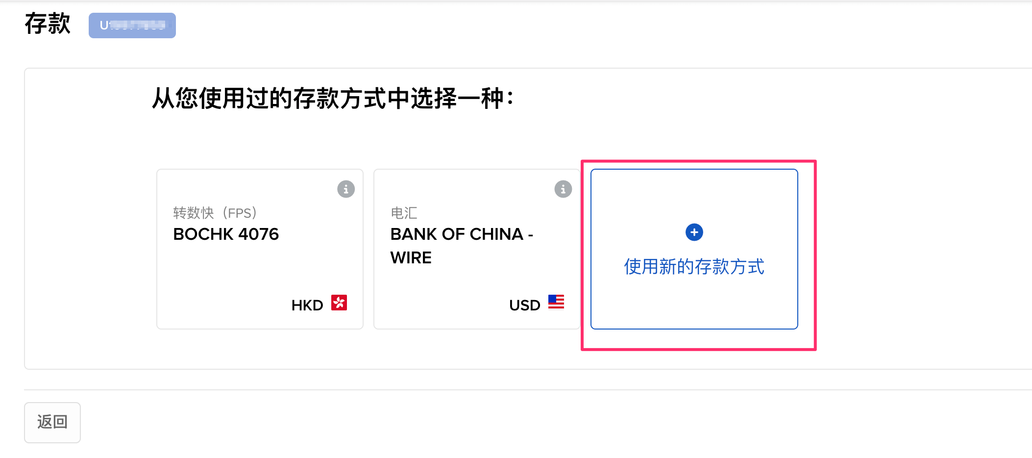 3、在选择存款方式页面,会保存之前创建过的入金方式。