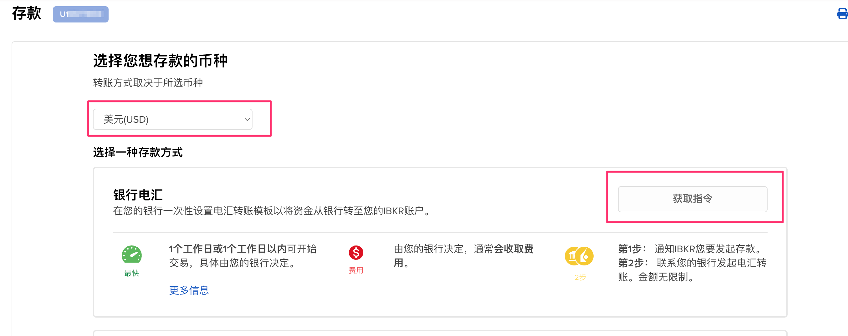 4、币种选择"美元", 汇款方式选择"银行电汇", 点击"获取指令"。