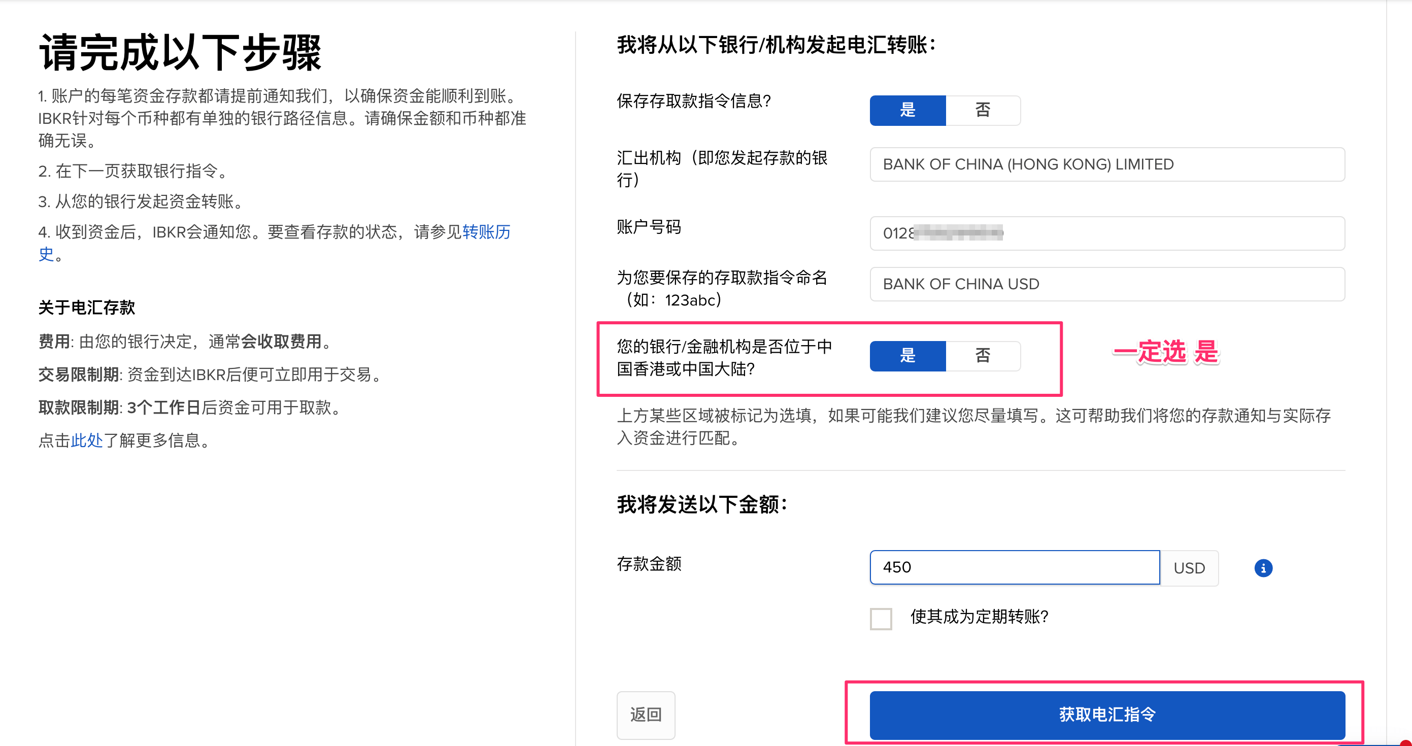 如果此处选择是,盈透提供的收款帐号就是香港帐号,我们就可以使用香港本地的特快转账(CHATS)系统,可以豁免手续费。(实测:中银香港、汇丰香港转到盈透的香港账户,都免手续费) - 存款金额: 顾名思义,你要转多少钱,按照实际写。