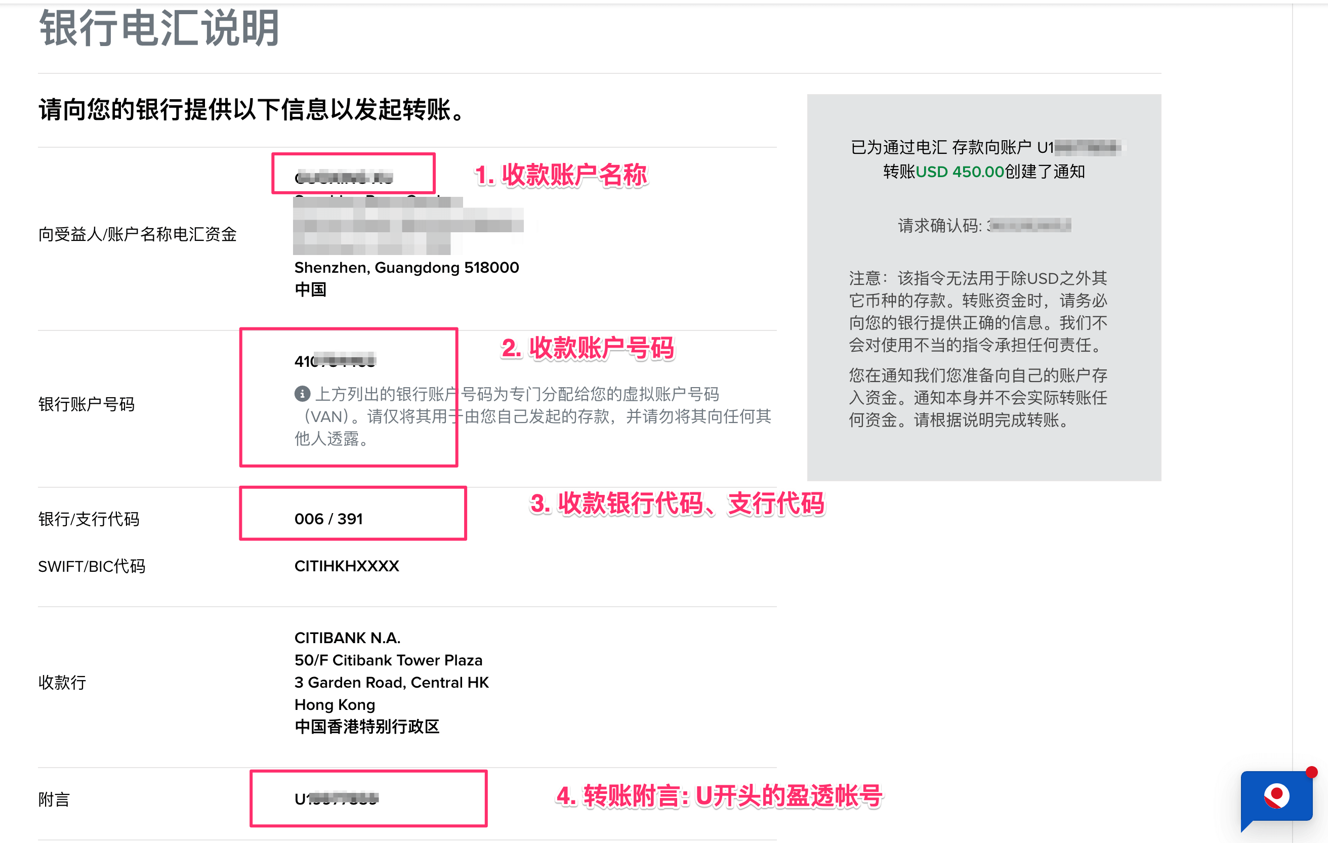 - 收款银行/机构: 根据盈透汇款指令中"银行代码"填写,我这里就是 "006 花旗银行香港分行"