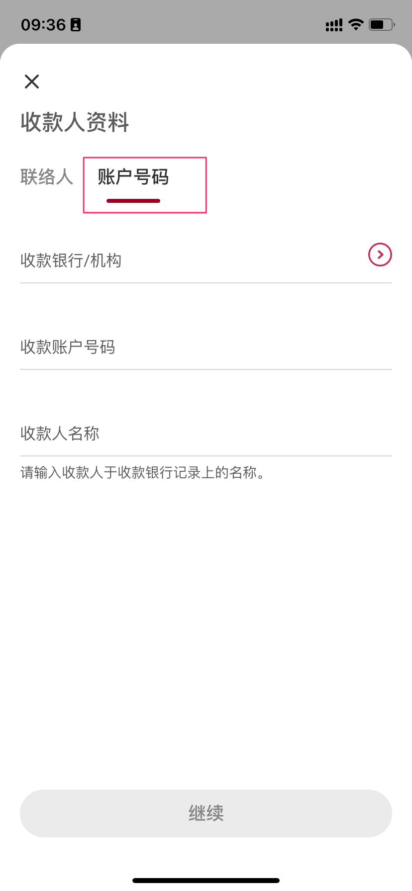 3、在收款人资料页面,选择"帐号号码",填写里面需要的资料。