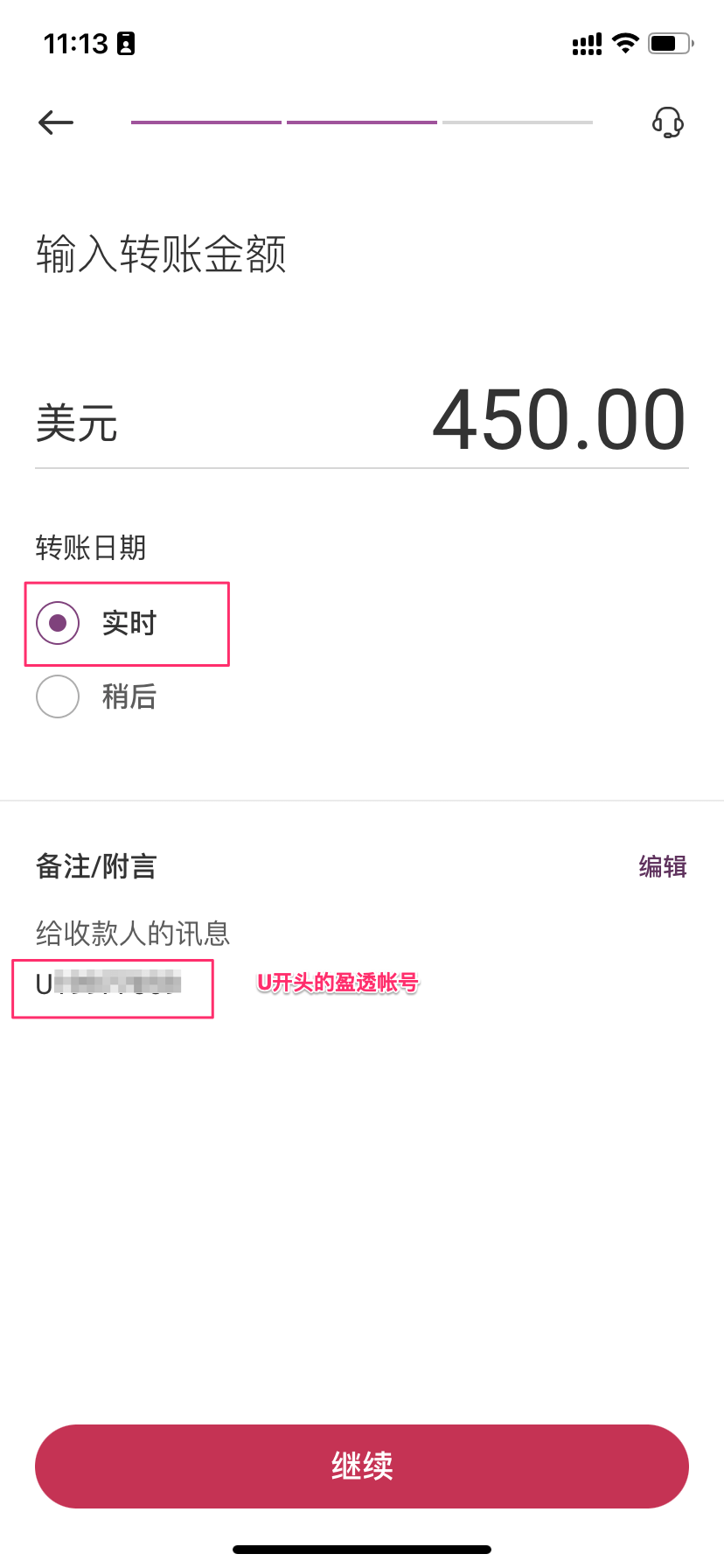 因为我们走的香港本地特快转账(CHATS),这个转账只能在香港工作时间进行。所以如果是在香港工作日银行上班的时间,转账日期可以选择"实时";如果非上班时间,就只能选择"稍后",等银行下个工作日上班才会操作转账。 - 附言