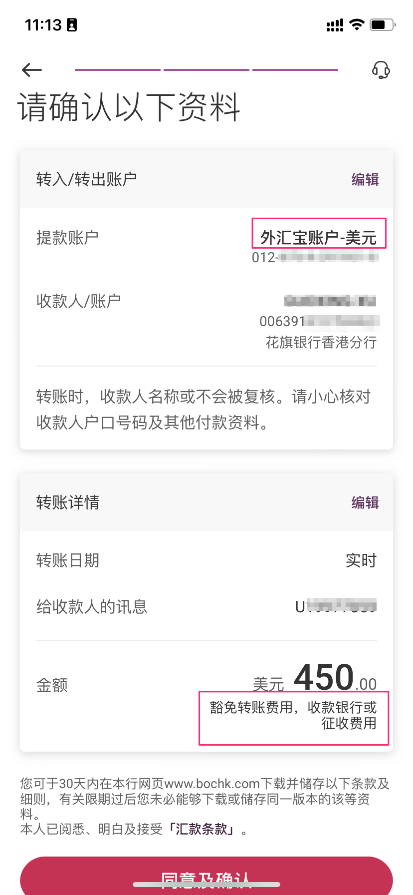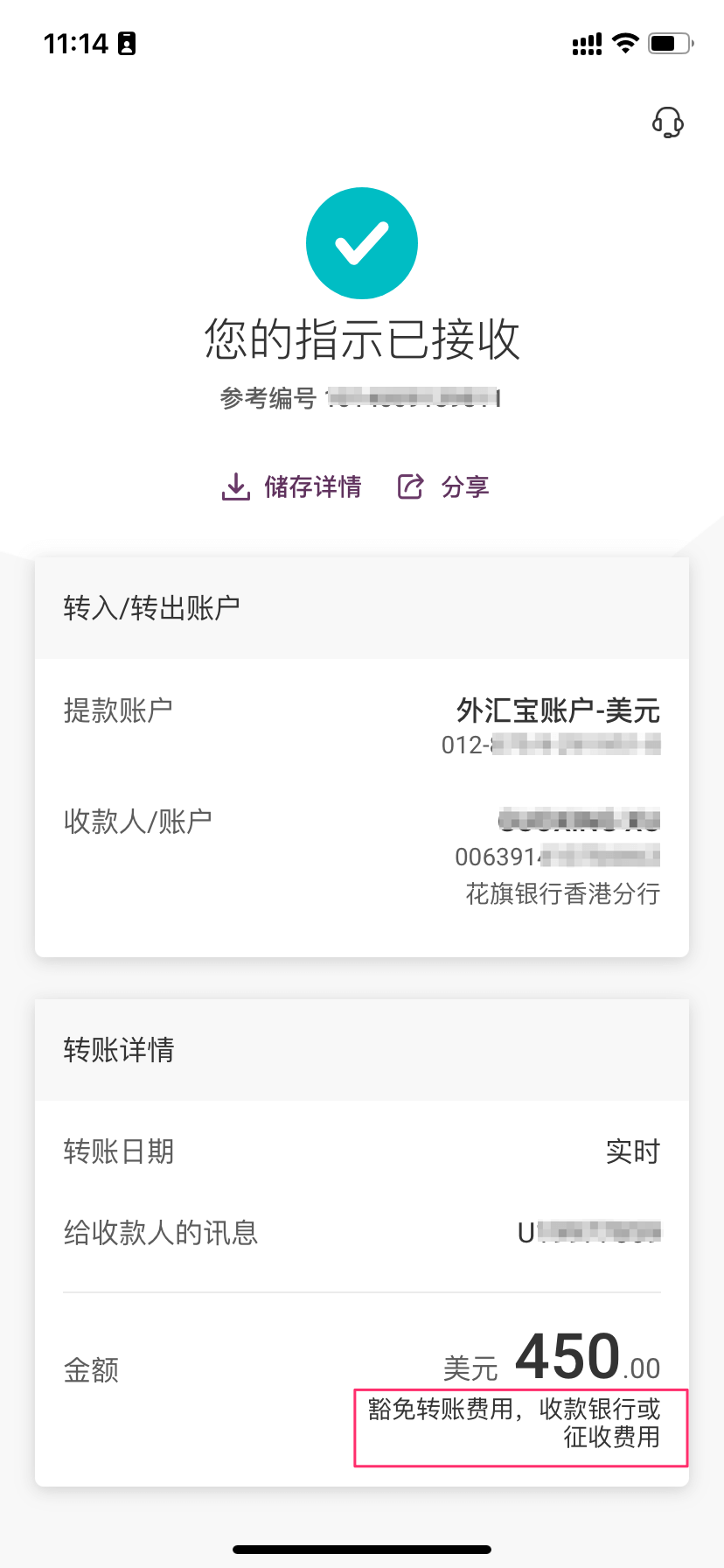 在这里可以看到,此次转账中银香港这边是豁免费用的。