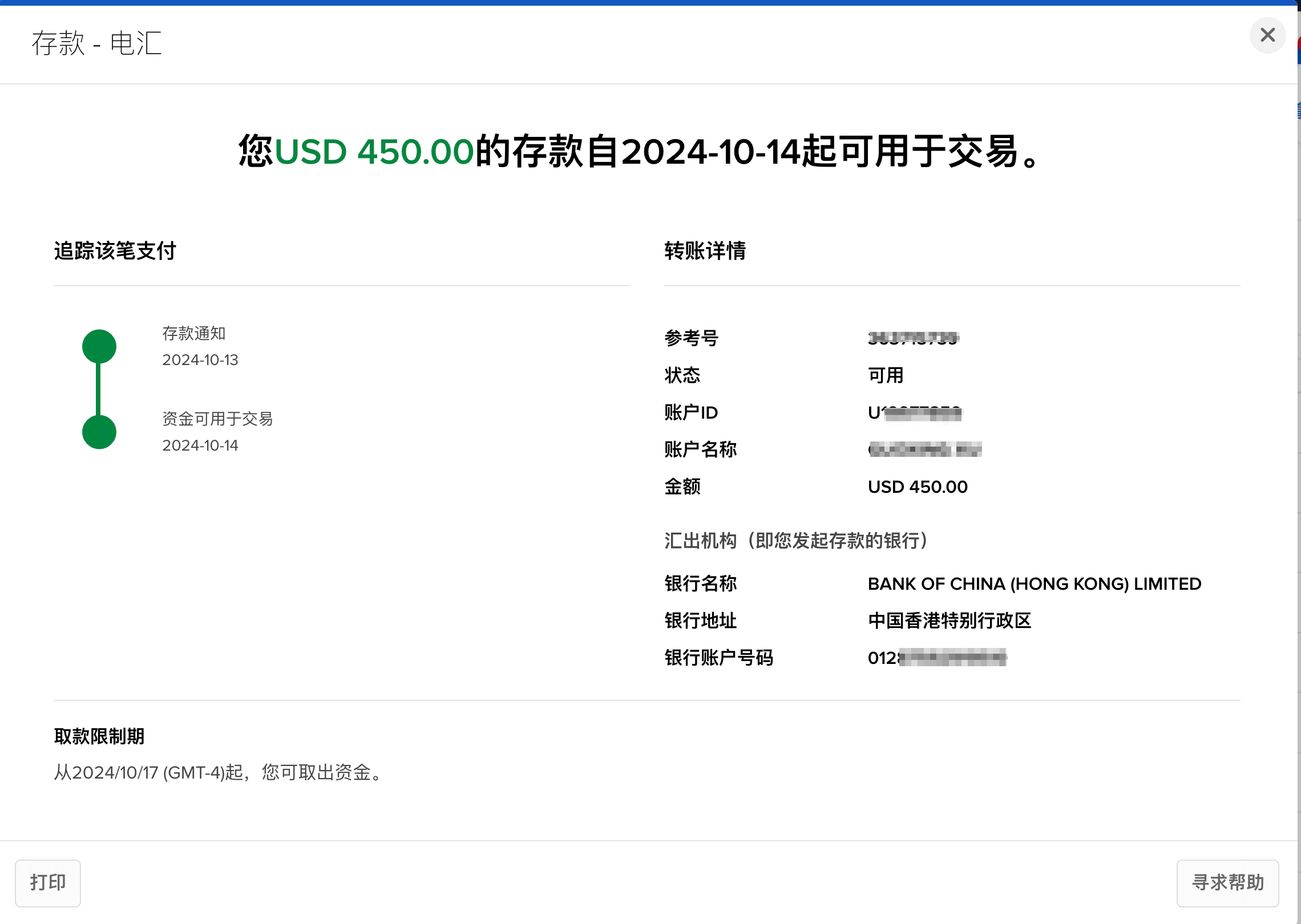 具体时间可能每个人会不一样,大家可以登录盈透后台,在"转账与支付" > "转账状态及历史"中,查看对应的"入金通知"的状态,状态为"可用"的时候就是入金成功了。
