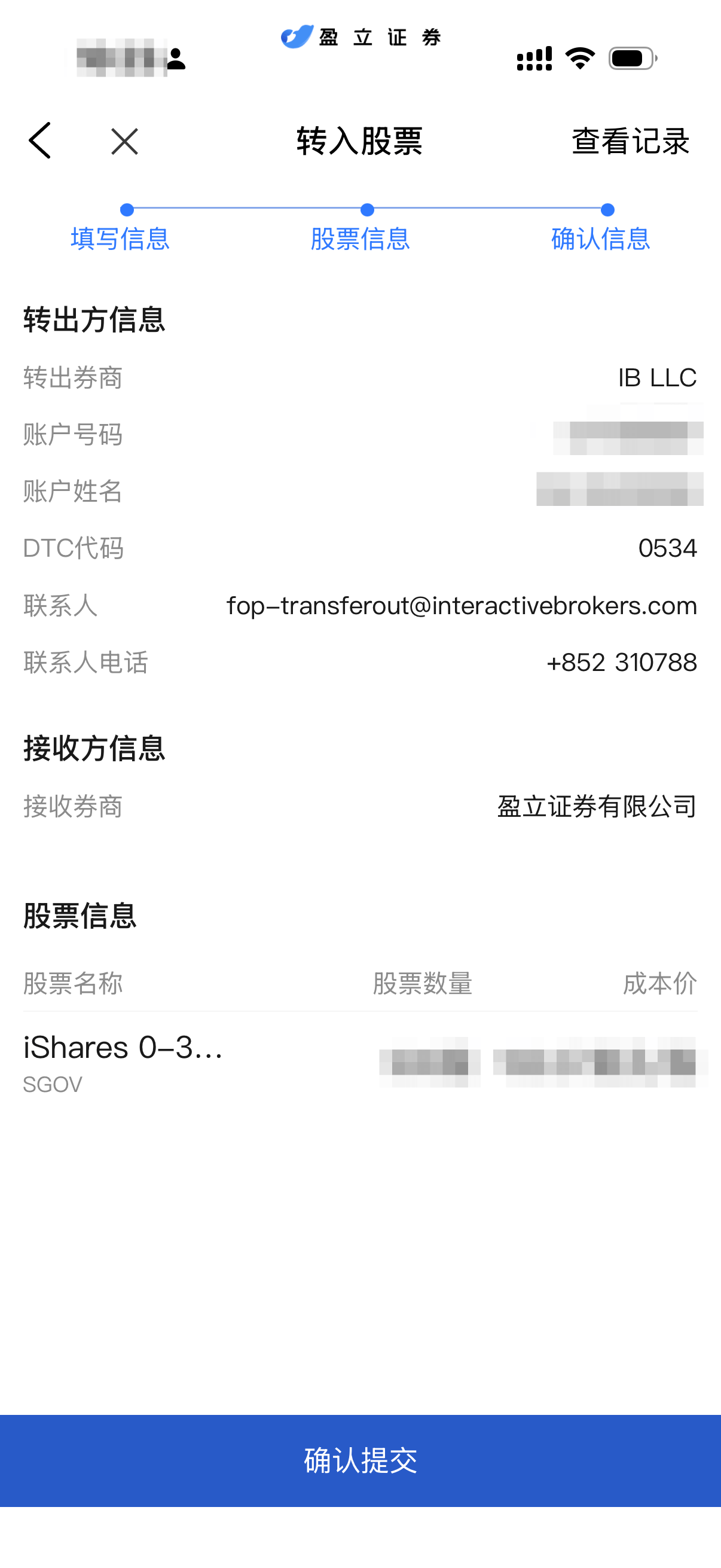- 转出券商:盈透不在盈立App预设的券商里面,这里就选 “其他证券”。