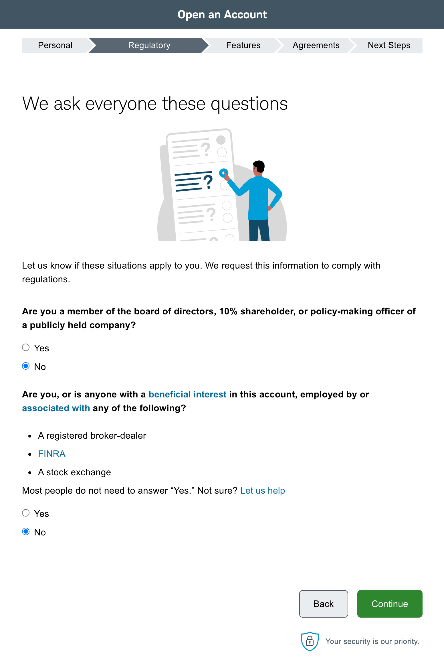14、回答问卷问题,对于大部分人,全部选「No」即可。