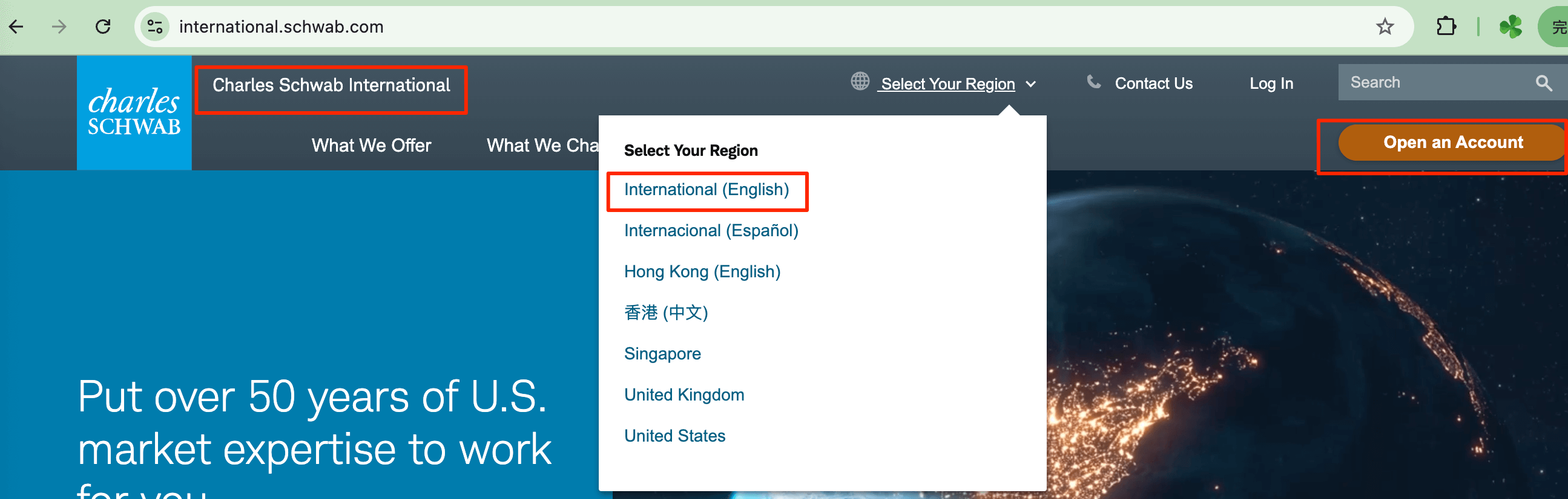 中国内地开户,需要确保左上角显示的是「Charles Schwab International(嘉信国际)」。