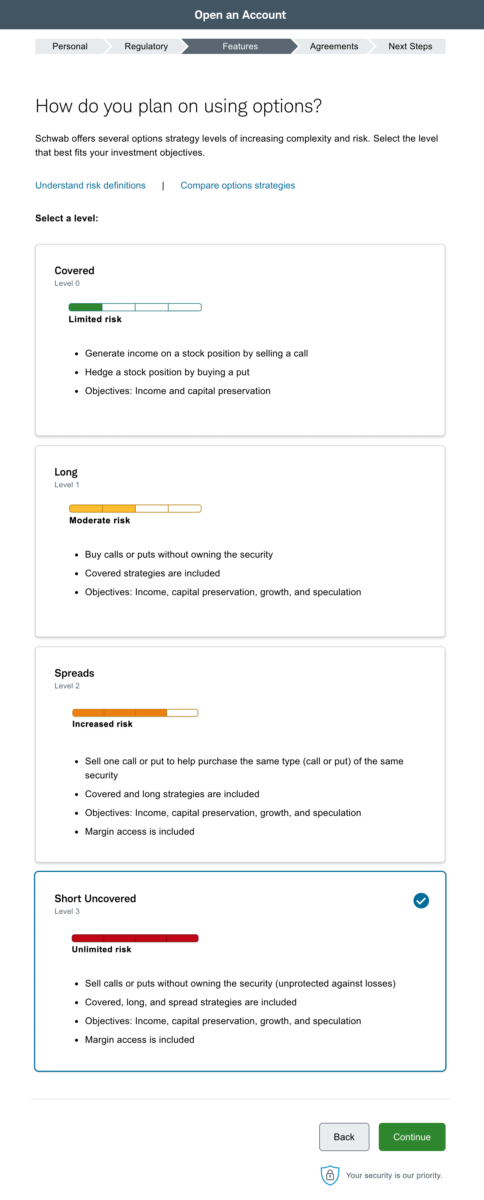 因为上面选择要开通期权交易,所以这里要选择哪个期权Level,从上到下,风险逐级升高。