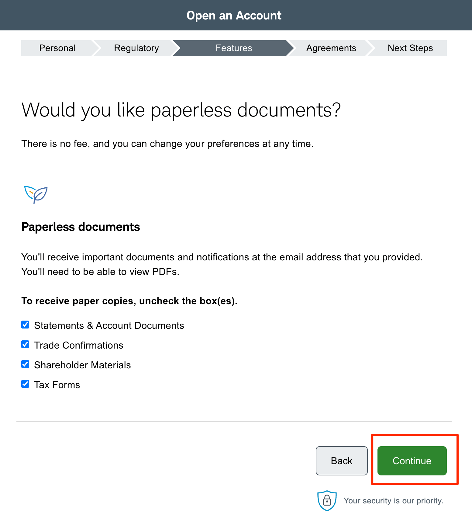15、无纸化设置,全部勾选,点击「Continue」。