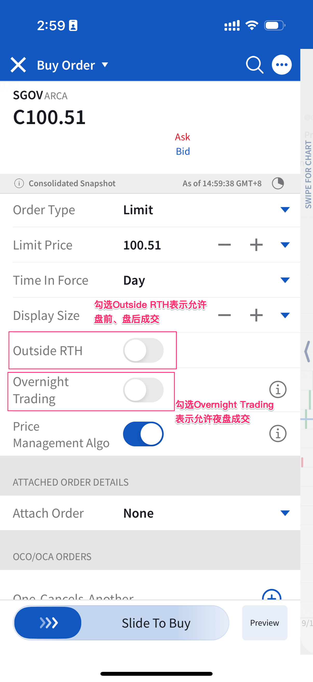 - 勾选Outside RTH: 表示可以在盘前、盘后时间段提交订单。