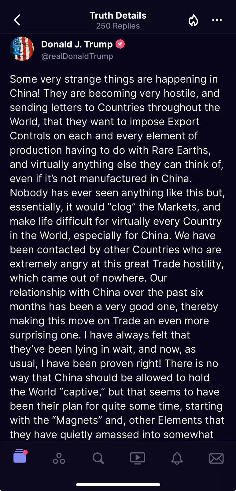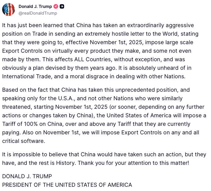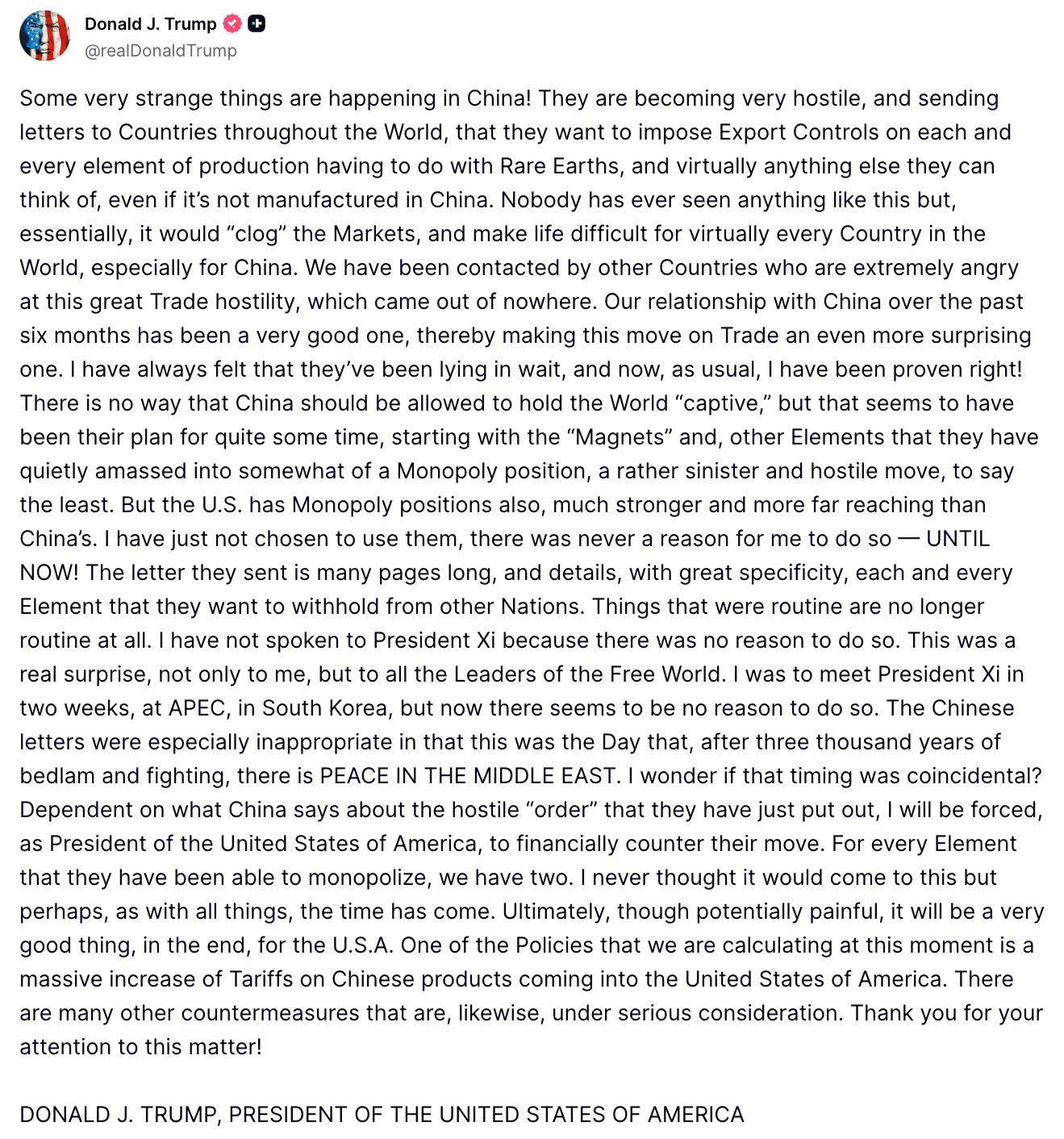 "It has just been learned that China has taken an extraordinarily aggressive position on Trade in sending an extremely hostile letter to the World, stating that they were going to, effective November 1st, 2025, impose large scale Export Controls on virtually every product they make, and some not even made by them.