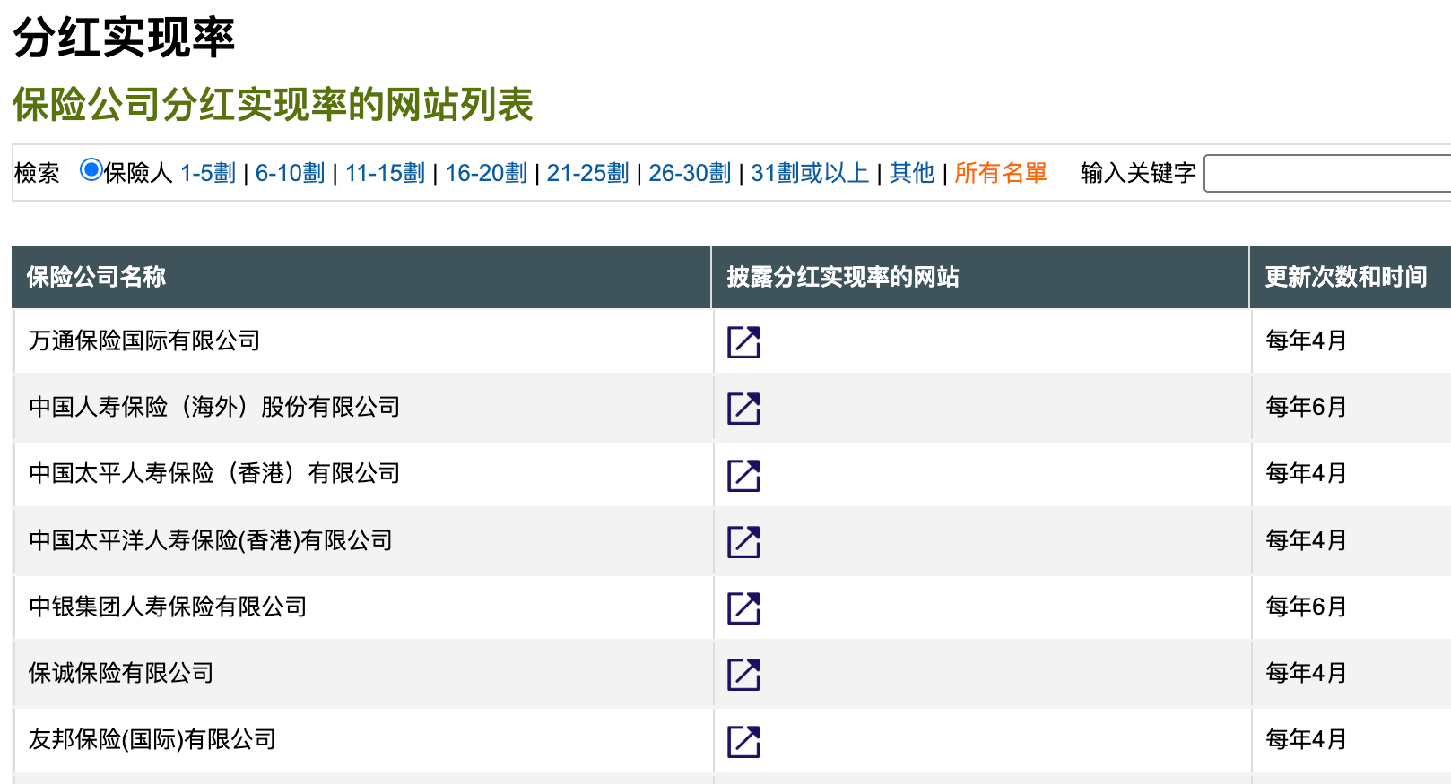 在香港保监局网站上,有一个专门的网页,列出了所有的香港保险公司公布「分红实现率」的网页,大家可以去看下。