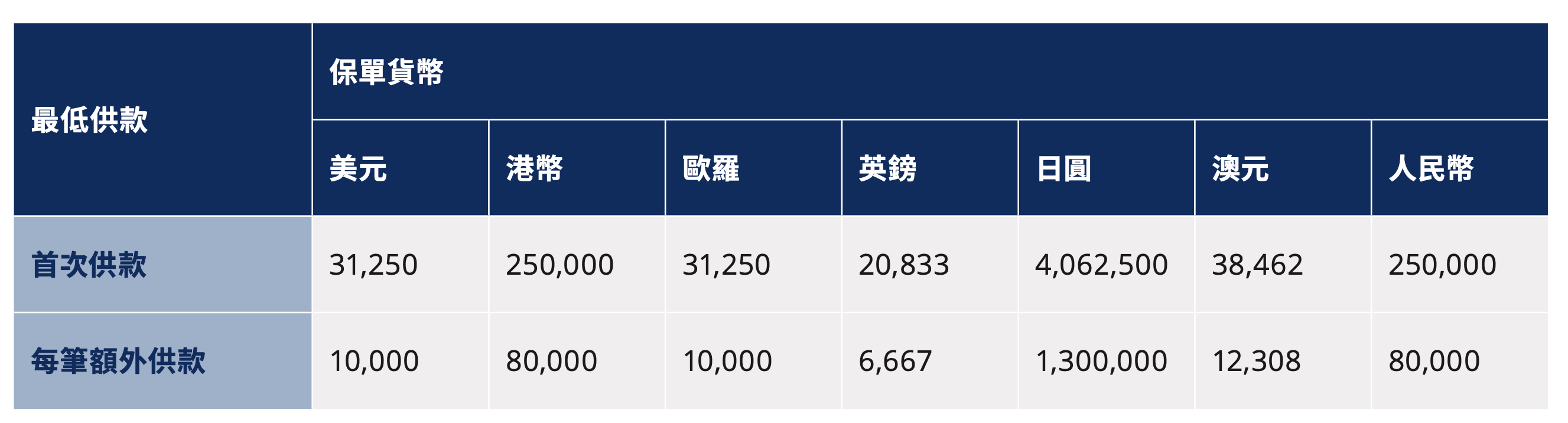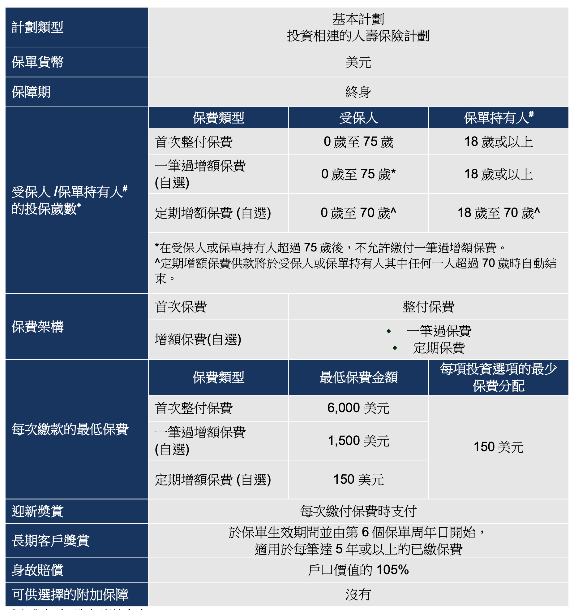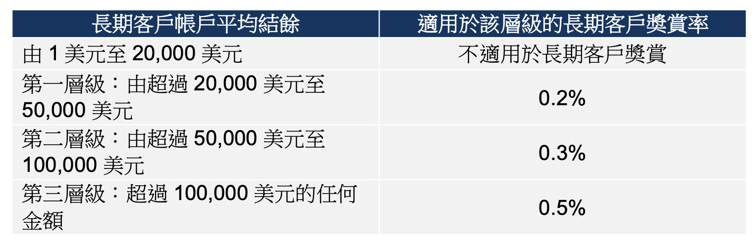 于保单生效期间,由第 6 个保单周年日开始及随后的每个保单周年日,保单将可享有长期客户奖赏,惟于过去 12 个保单月份,长期客户帐户平均结余须超过20,000 美元。
