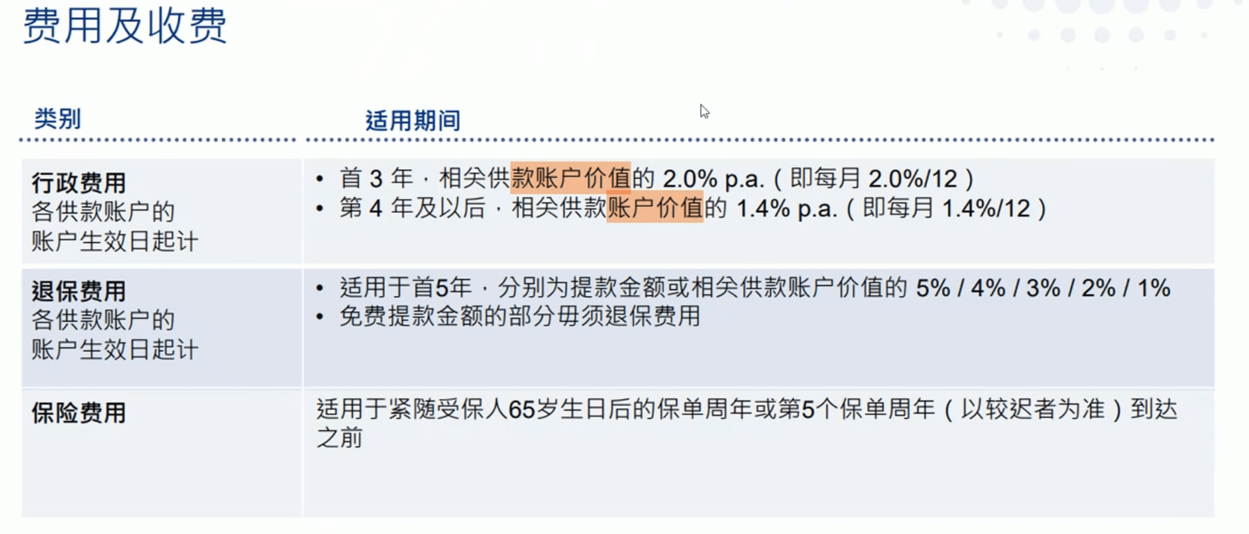 - 第1-3年,行政费率为账户价值的2.0%(每月扣除,即每月扣除2.0%/12)