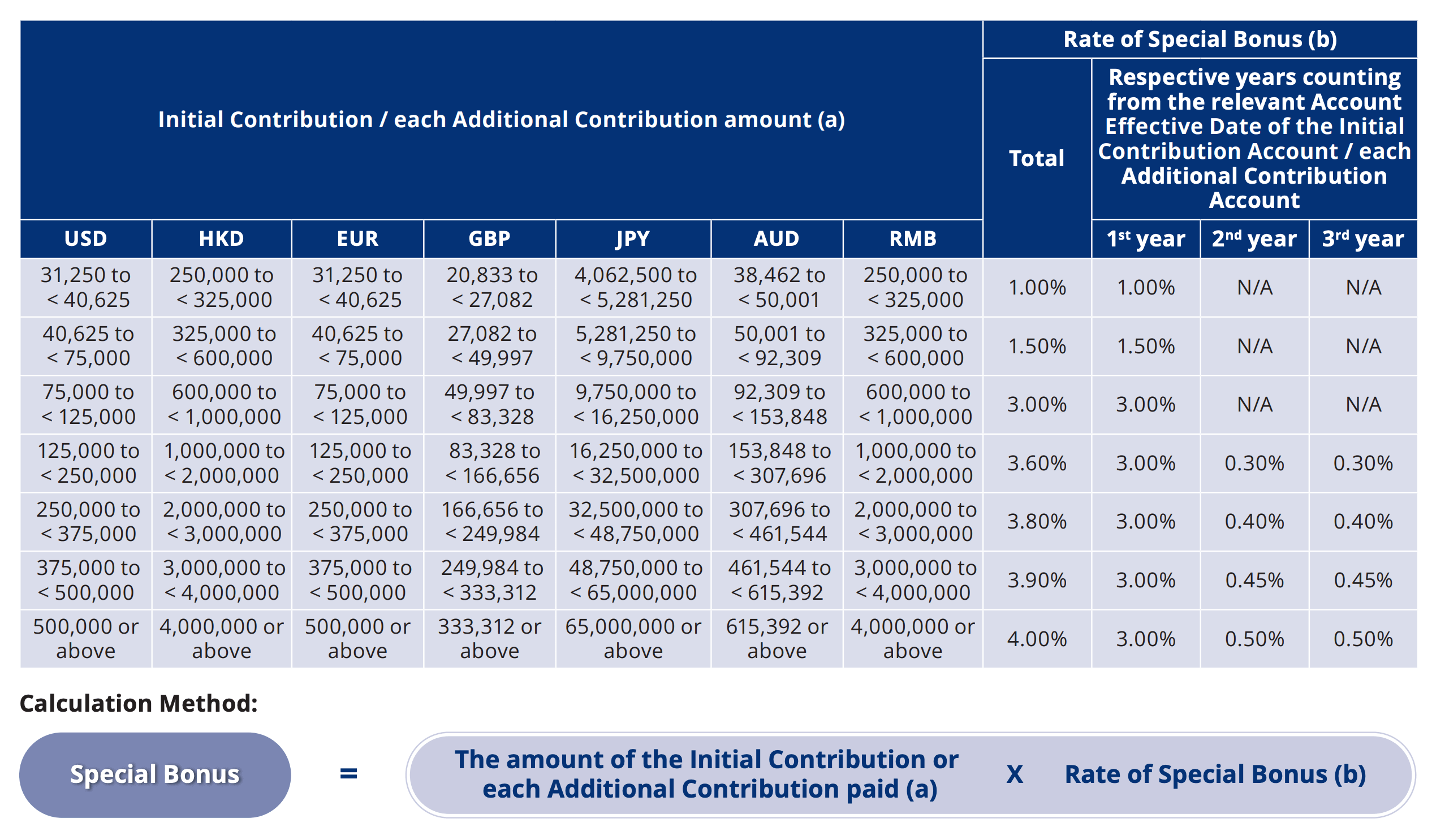 额外单位奖赏 = 已缴首次供款或每笔额外供款金额 x 额外单位奖赏率