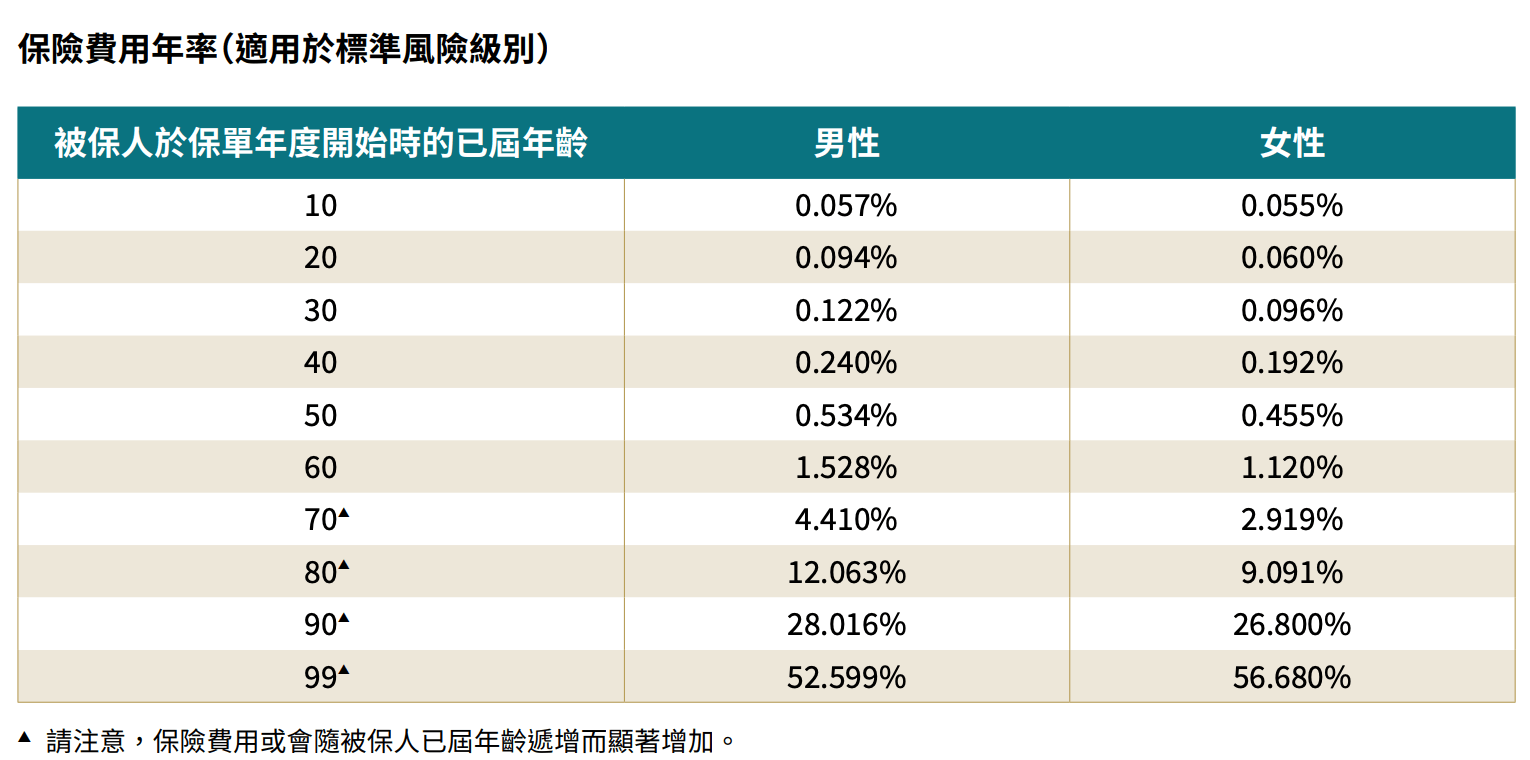 即:如果是40岁,非吸烟男性,每年的保险费是:风险净额的千分之0.88。