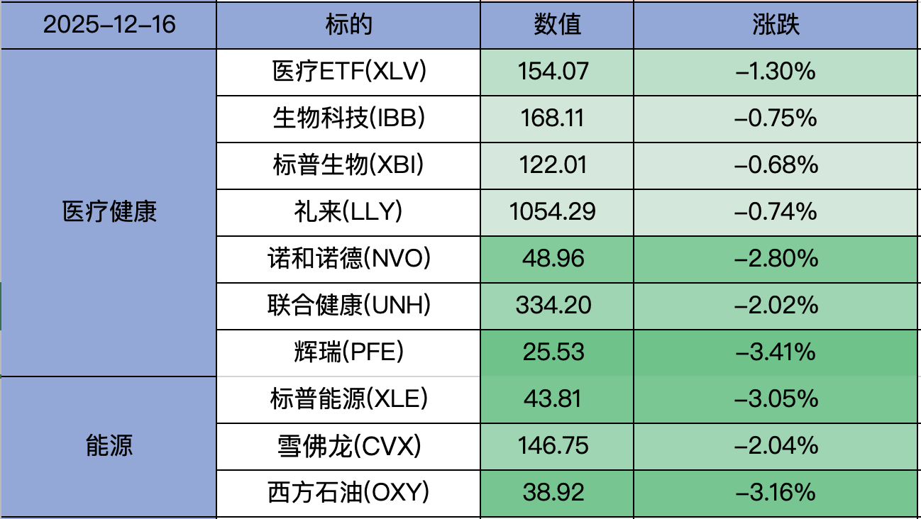 油价继续下跌,布伦特原油跌破60美元,能源指数ETF(XLE)下跌3.05%,西方石油下跌3.16%。