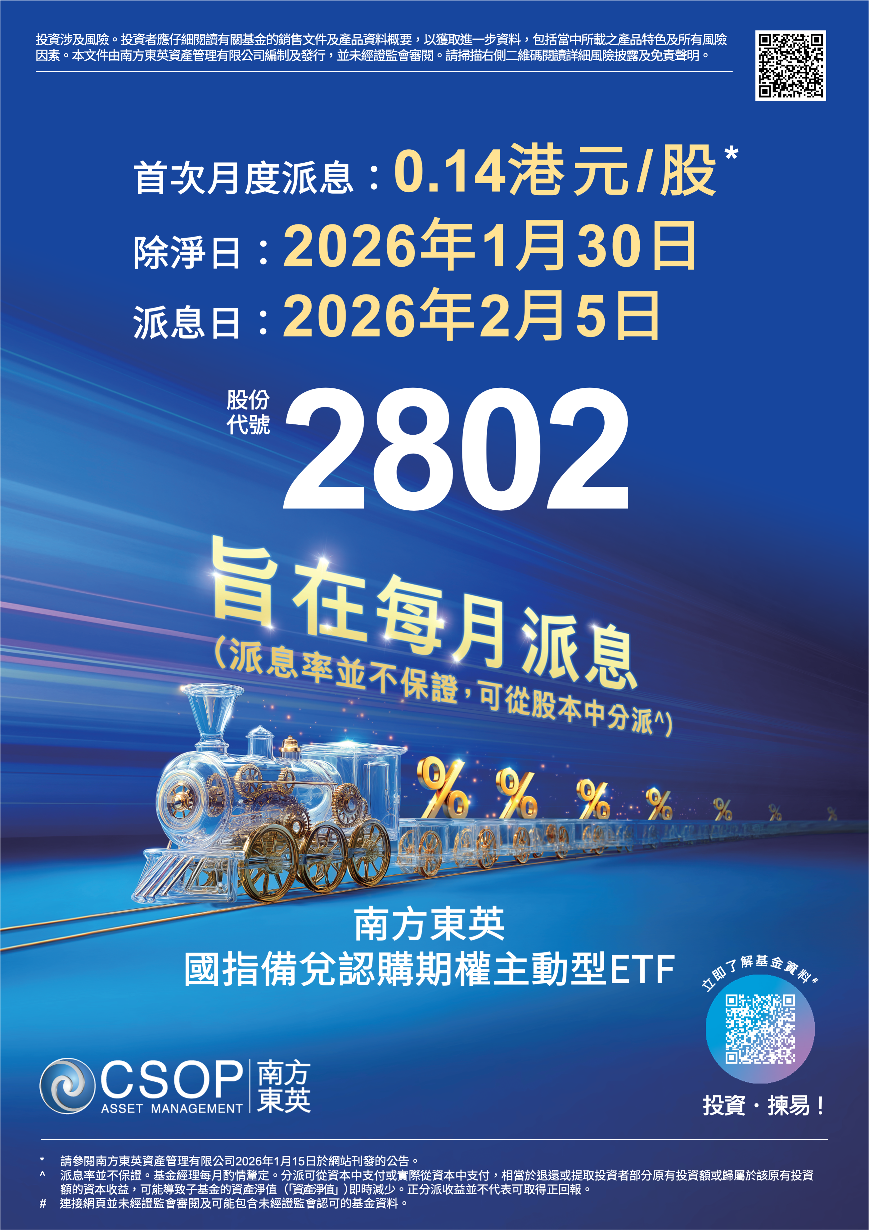 南方东英的2802要在2026年1月30日除息,2026年2月5日派息,每股派0.14港元,折算年化派息率19%。
