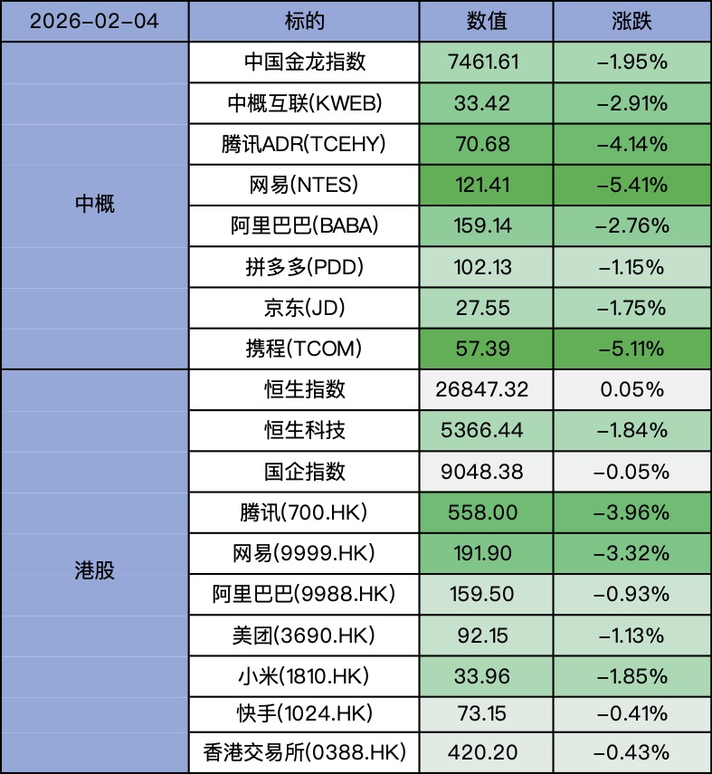 腾讯ADR下跌4.14%,近期高点回撤19%;阿里巴巴下跌2.76%,近期高点回撤17%;网易下跌5.41%,近期高点回撤约24%。