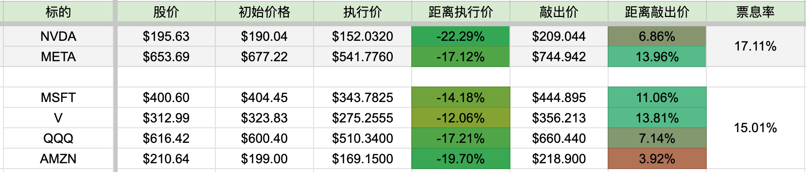 下跌最多的是Visa,距离执行价还有12%的距离,也是很安全,敲入风险也很低。