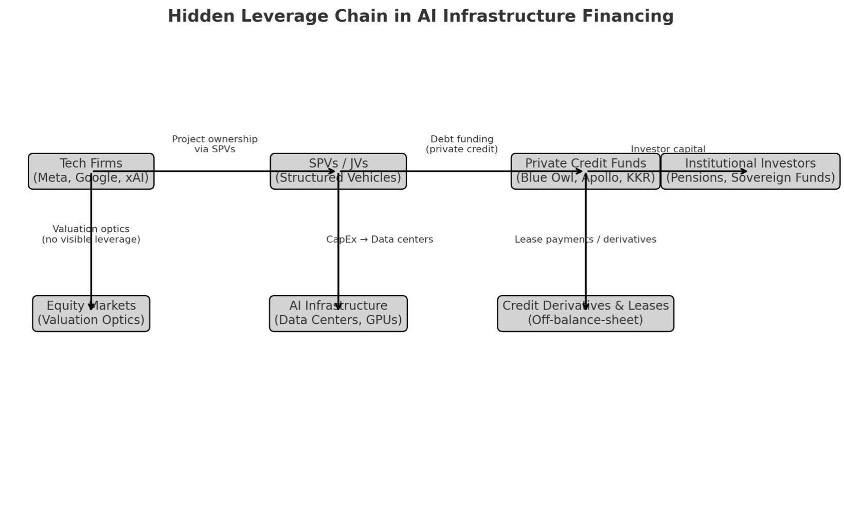 (最終風險承擔者) 養老基金/ETF投資人/主權基金→ (中介機構) 私募信貸基金→ (融資實體) SPV 或 Neocloud (如 CoreWeave) → (最終使用者) 科技巨頭 (如 Meta)